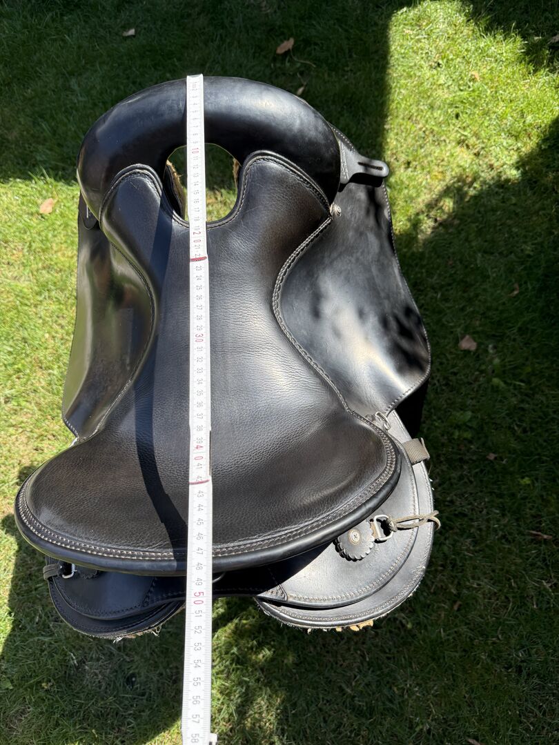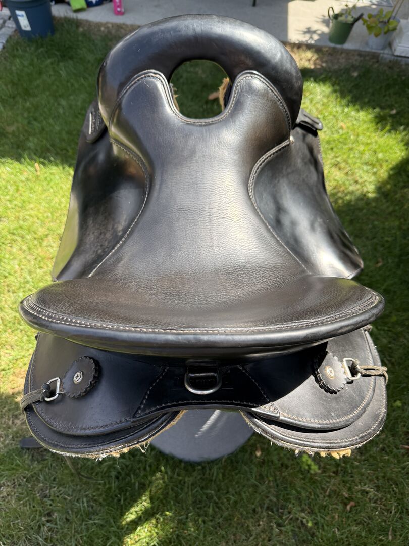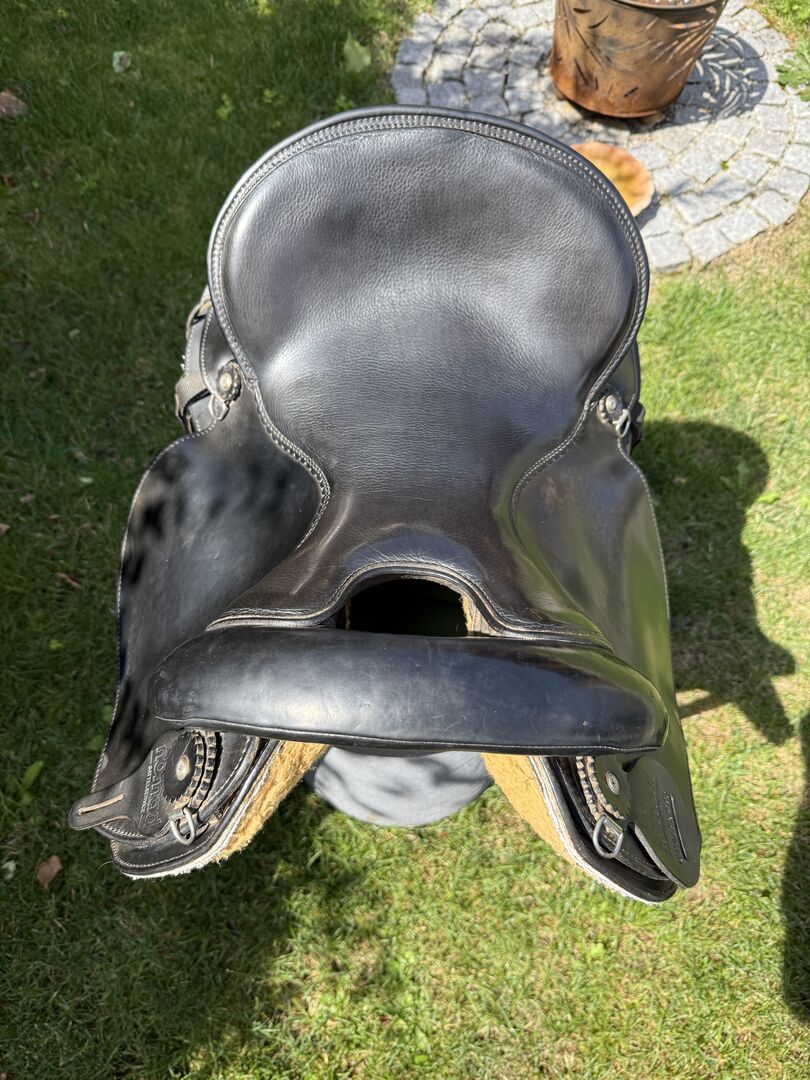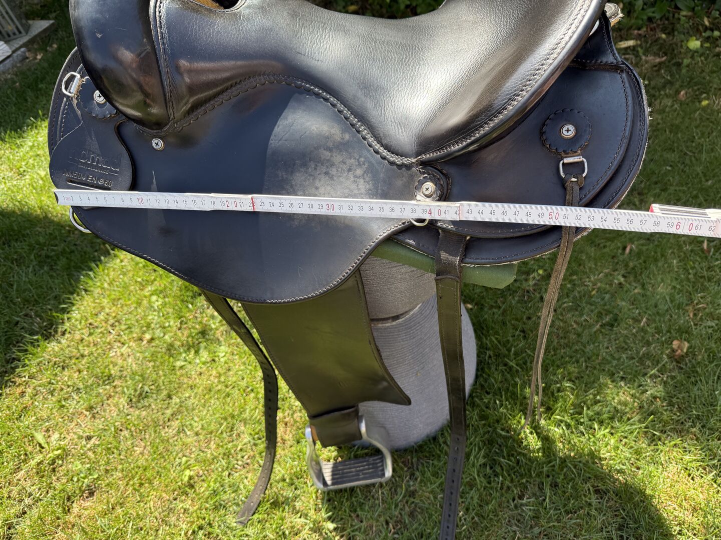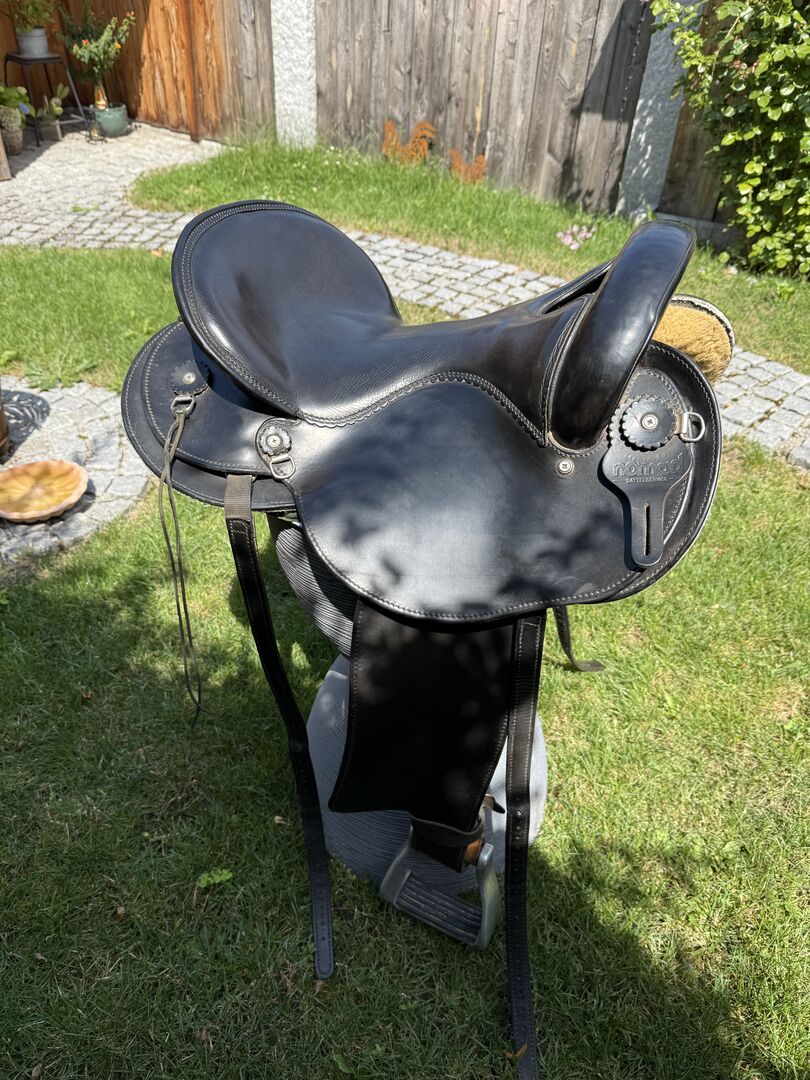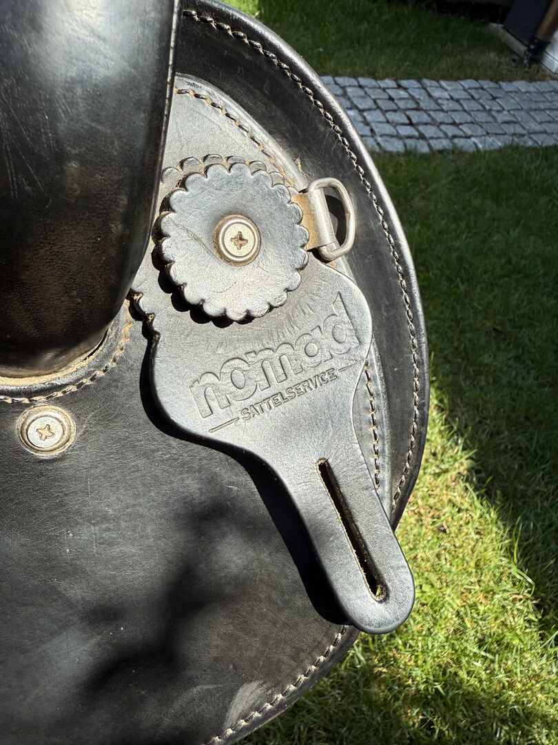 Nomad western/fritid/vandrings-sadel - Jag erbjuder en mycket välskött Nomad fritidssadel. Den är tillverkad av vackert tjockt svart läder och användes senast på mitt gamla Quarterhorse-sto. Eftersom hon tyvärr inte längre är i livet vill jag gärna skiljas från hennes sadel. Den har alltid använts med ett lammskinnsskydd (se sista bilden) och sitsen är därför som ny. Vänligen kontakta mig om du har några frågor.