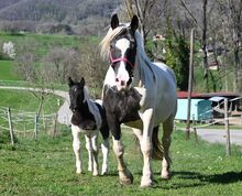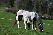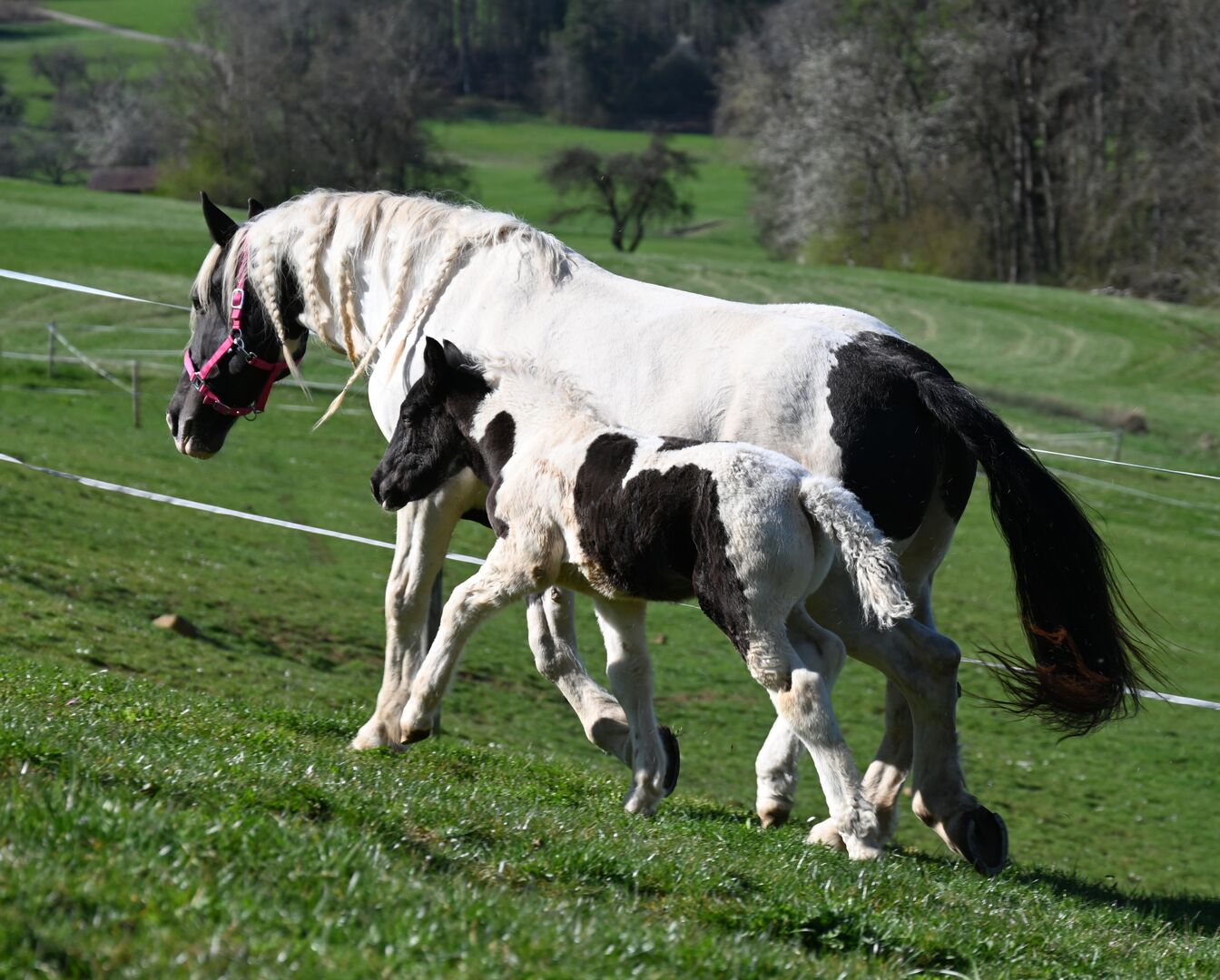 Noriker svart pinto sto med föl till våren 2026 - Jasmina är född den 21.05.2017, hon är ca 161 cm lång och har en mycket älskvärd och godmodig karaktär. Hon har också en otrolig karisma och trollbinder människor. Hon är mycket välriden, både i terrängen och på ridbanan. Hon rids på vår ridskola och kan även ridas bra av nybörjare. Hon är orädd och trafiksäker. Jasmina är registrerad som hingstmamma i stamboken på 7,50, hittills har hon fått 3 föl, 2 pintoföl och ett svart föl, alla av god kvalitet. Hon är efter Hennessy Schaunitz med föl till våren 2026. Jasmina har en bra hals och en mycket väldelad korsrygg, bra gångarter med en mycket fin marktäckande trav. Hon är skodd 4 gånger och bör förbli så, hon är testad PSSM1-fri, vaccinerad och regelbundet avmaskad. Jasmina klättrar in i hästtrailern med gott beteende och är mycket glad i sadeln. Hon är absolut orädd och vägvärdig. Hon går ut på egen hand, känner till andra lantbruksdjur och gillar barn.
