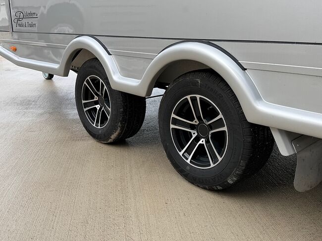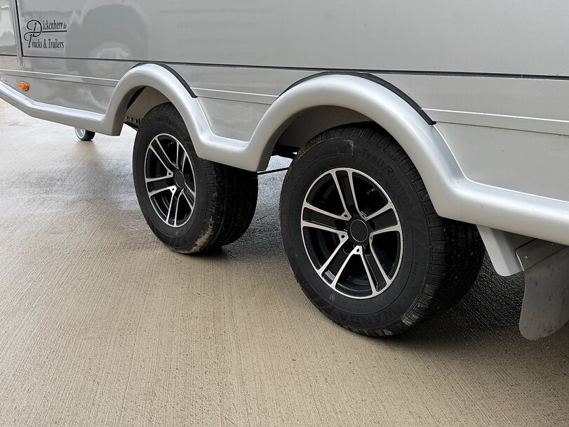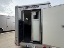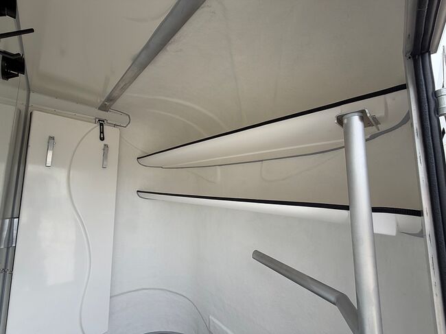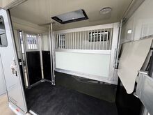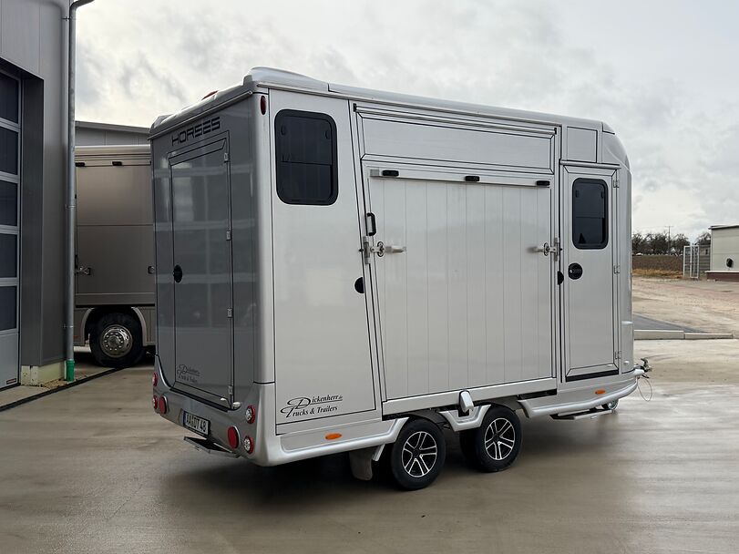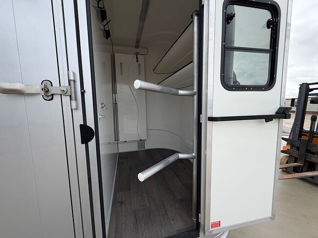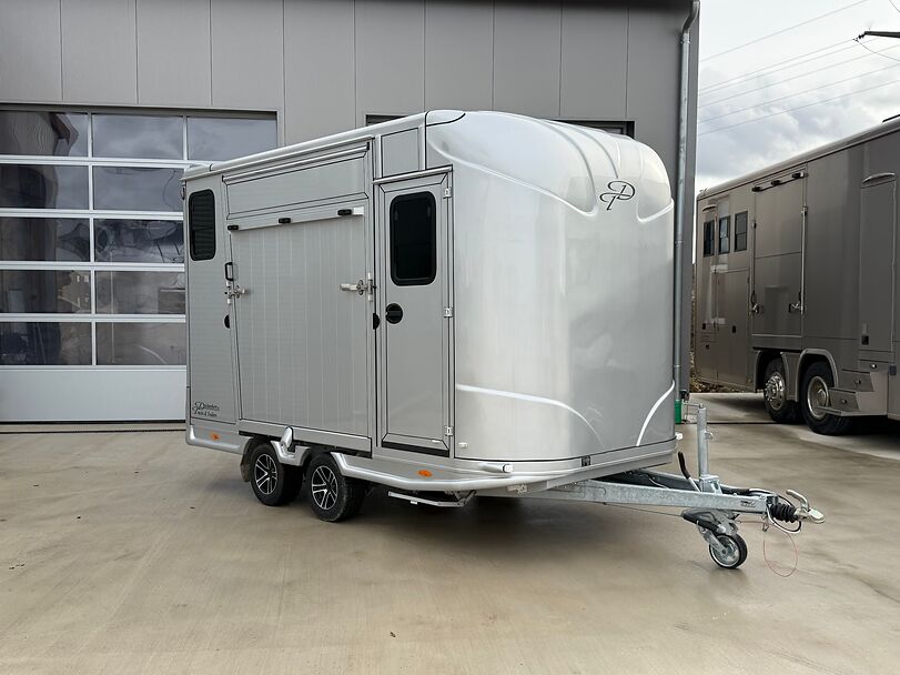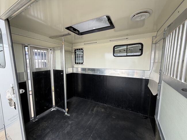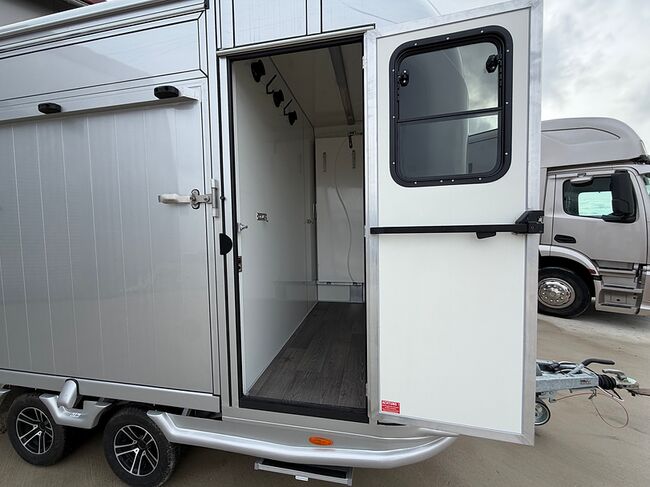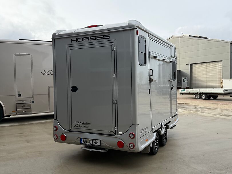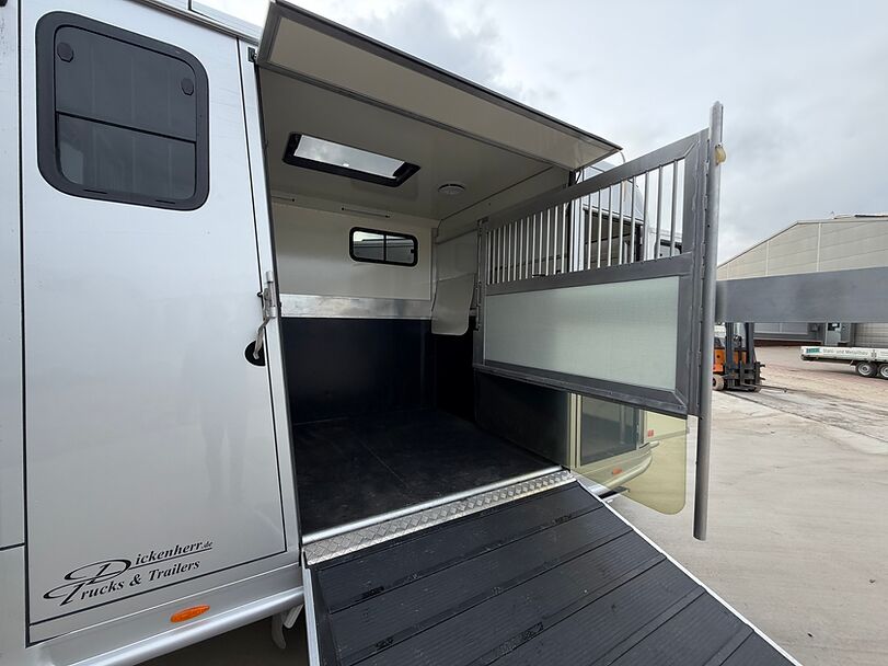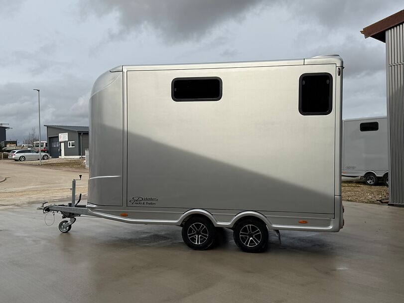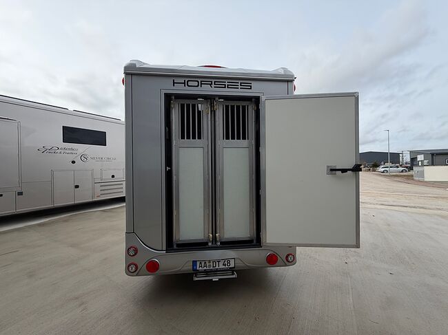 Golvkonstruktion av aluminiumprofiler med limmade på ett höghållfast gummigolv, 30 mm tjocka, helt isolerade sido- och takpaneler, aerodynamisk frontdesign Låsbar sidodörr till höger med fällbart trappsteg, sadelkammare, fällbar säng (nödsäng), 2 takhyllor integrerade i framväggen, svängbar sadelhållare för 2 sadlar, surrningsöglor för sadelkammare, många träns och kappkrokar Sidoramp med ventilationslucka ovanför, 2 nedfällbara fönster vid hästarnas huvud, ytterligare ett längsgående skjutfönster, stor taklucka, elektrisk takventilation kan kopplas från sadelkammaren, mittvägg med höga stänger och transparent gardin, hingstvägg vid hästens huvud, plank vid rampen, stor ytterdörr bak, två mycket stabila hingstväggar vid bakdörren, individuell åtkomst till båda hästarna möjlig i varje fall