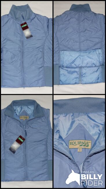 - Märke: Equipage - Storlek: L - Färg: Ljusblå - Avtagbara ärmar med manschetter - 2-vägs dragkedja - två sidofickor med dragkedja - två ridspår baktill - Lätt fodrad - 100 % polyester - tvättbar i 30°C - originalpris 49,90 €.