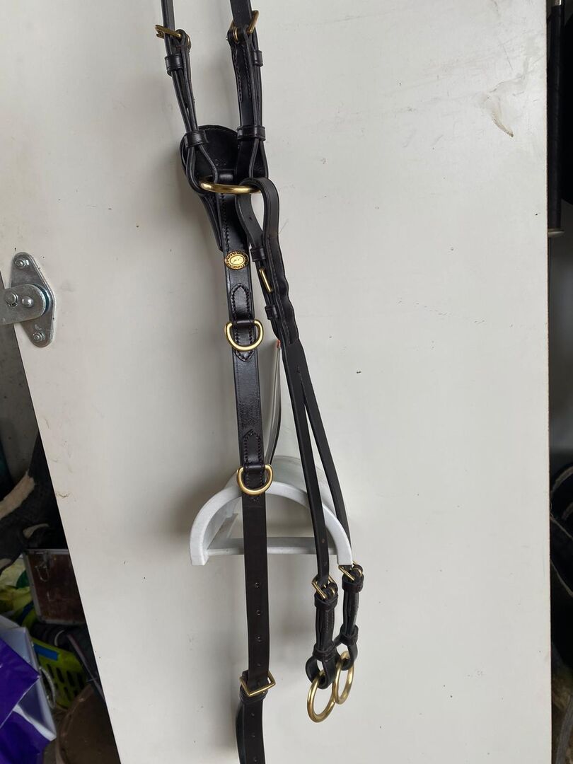 Ny bröstplatta i brun färg - Säljer en ny, mörkbrun bröstplatta, storlek fullblod. Läder av hög kvalitet, bruna elastiska inlägg och avtagbar gaffel. Särskilt vackert tack vare de gyllene tillbehören. NP: 129,00