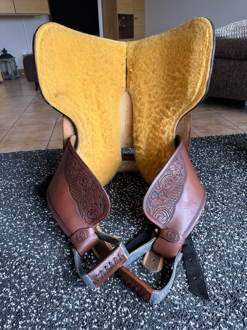 Ny Deuber & Partner Flex Fit Vario Western-sadel Equitation Trainer - Jag säljer min toppkonditionerade show sadel från Deuber und Partner Flex Fit Vario 2213 - Equitation Trainer med Equitation Seat. Sadeln har använts väldigt lite på grund av min hästs sjukdom och är i nyskick. Det var bara hemma för det mesta. Sadeln var alltid ordentligt omhändertagen och hölls bara i sitt skyddande lock och åkte med en sadelpad. Mindre tecken på användning finns ändå.