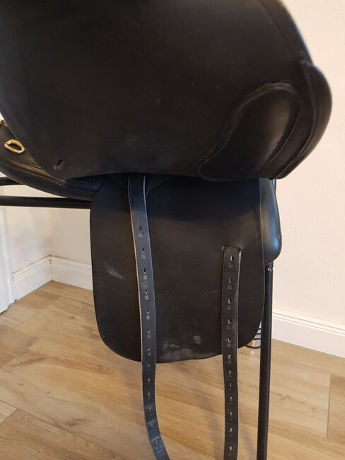 Oakfield Klassisk guide - Jag säljer min resesadel i dressyrstil från WayOutWest, Remscheid. Modellen heter Oakfiel Classic Guide och tillverkades exklusivt för WayOutWest av den välkända tillverkaren Sommer fram till för några år sedan. Sits 18 tum, ursprunglig kammarbredd 31,5, justerades en gång lite snävare av sadelmakaren. Sadeln har använts men är i toppskick (se bilder) eftersom den har tagits om hand regelbundet, förvarats på en torr plats och regelbundet kontrollerats av sadelmakaren. På grund av hästens död har den inte ridits under de senaste 3 åren. Tyvärr passar den inte alls min unga häst, så den kan nu gå vidare, eftersom den är för bra för att hänga kvar. Den passar hästar med en lätt kurva i ryggen, kan justeras i det oändliga av sadelmakaren i kammaren och har supermjuka, viktfördelande paneler, som liknar en traditionell sadel.