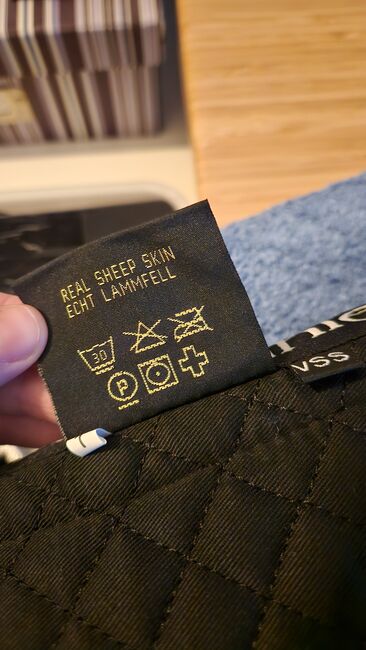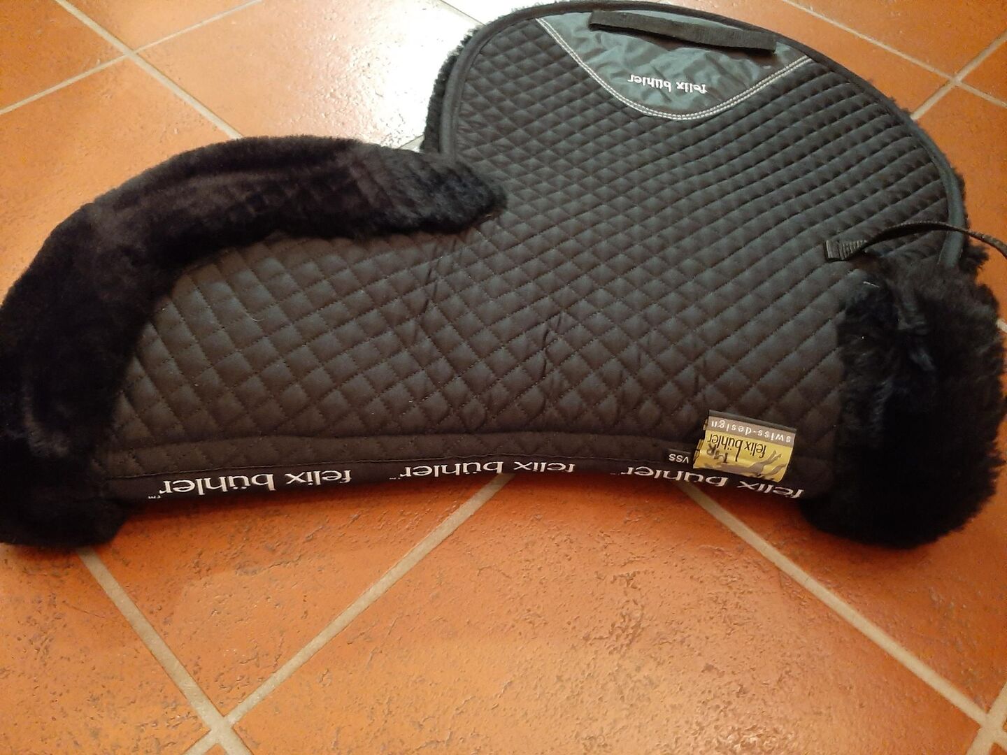 Jag skulle vilja sälja en oanvänd, svart, helfodrad sadelpad i lammskinn för varmblod från Felix Bühler.