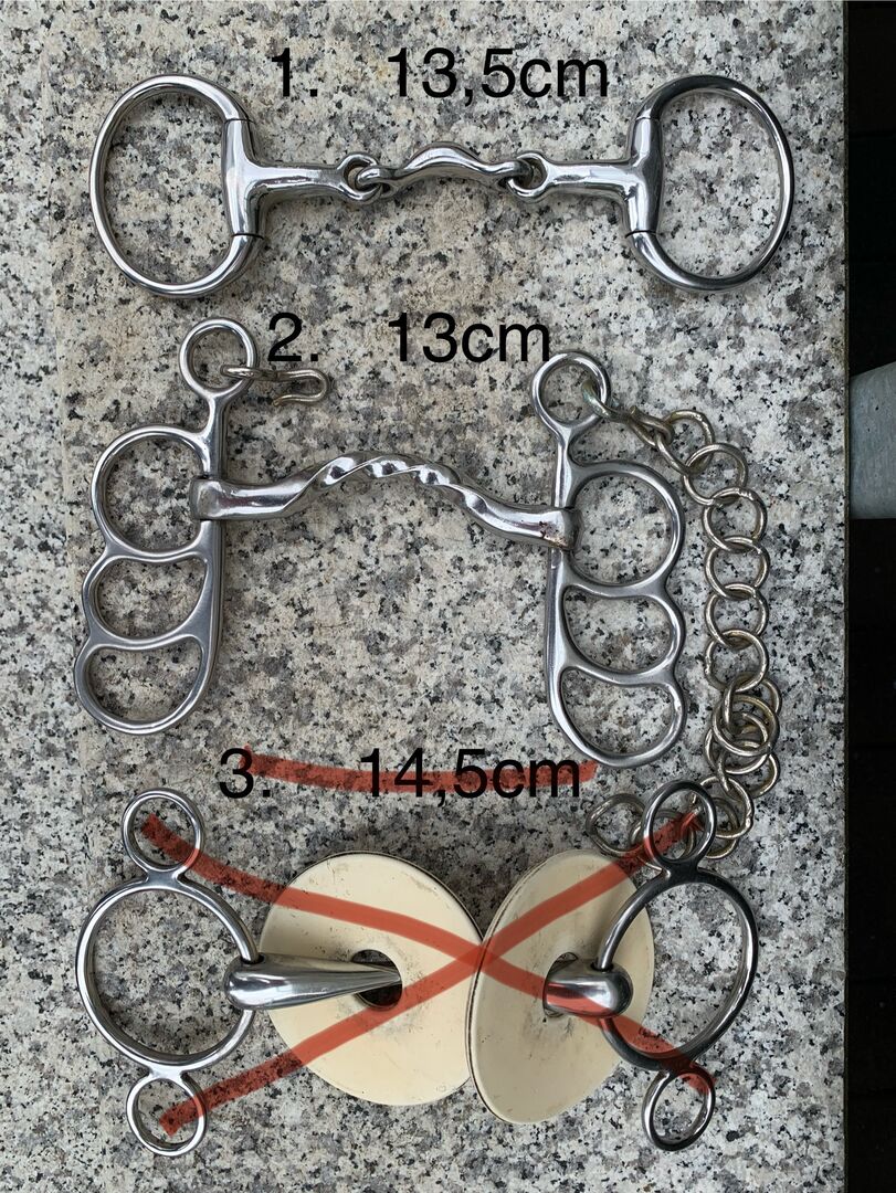 Olika bitar (13-14,5 cm) - Bit 1: Oliv huvudbit, dubbelbruten, med fri tunga och tro koppar (se foto) - 13,5cm (8€)
