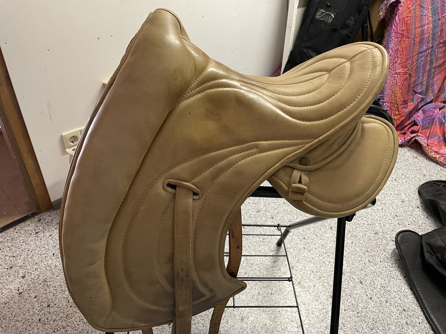 Omega sadel Mercedes - Välskött sadel av hjortskinn, mått som visas på bilderna, även med matchande sadelgjord och stigbyglar