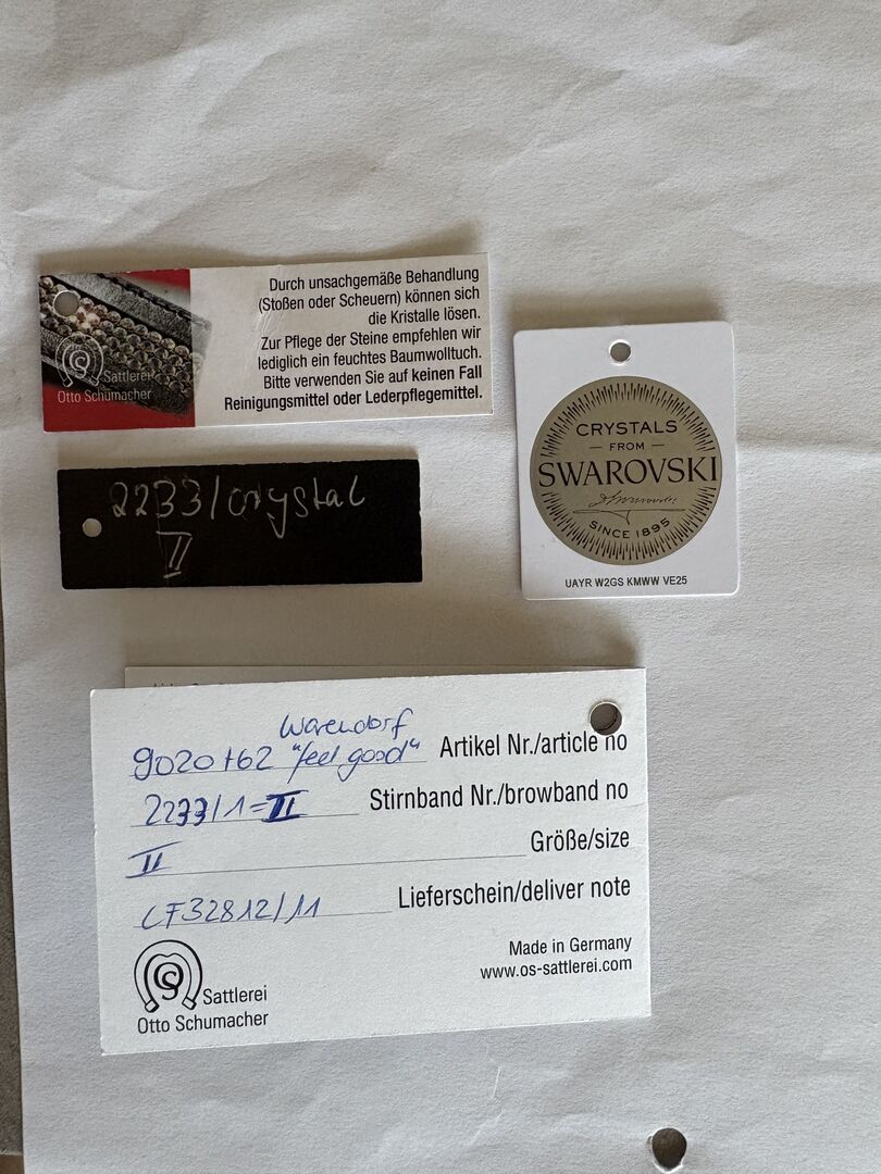 Otto Schumacher Snörning Feel Good Warendorf - En platt sydd träns Warendorf "Feel Good" av Otto Schumacher, med anatomiskt format svenskt nosgrimma. Det svängda pannbandet är utsmyckat med Swarovski Rivoli XL 12 mm kristallstenar, infattade i silver. Mycket väl vadderad nosgrimma och hakrem i svart. Huvudstycket på tränset är också mjukt vadderat, typisk "Feel Good"-modell. Inköpspriset för detta träns var €700. Fakturan finns tillgänglig. Tränset har endast använts under en kort tid, max 6 månader, så det är i toppskick.