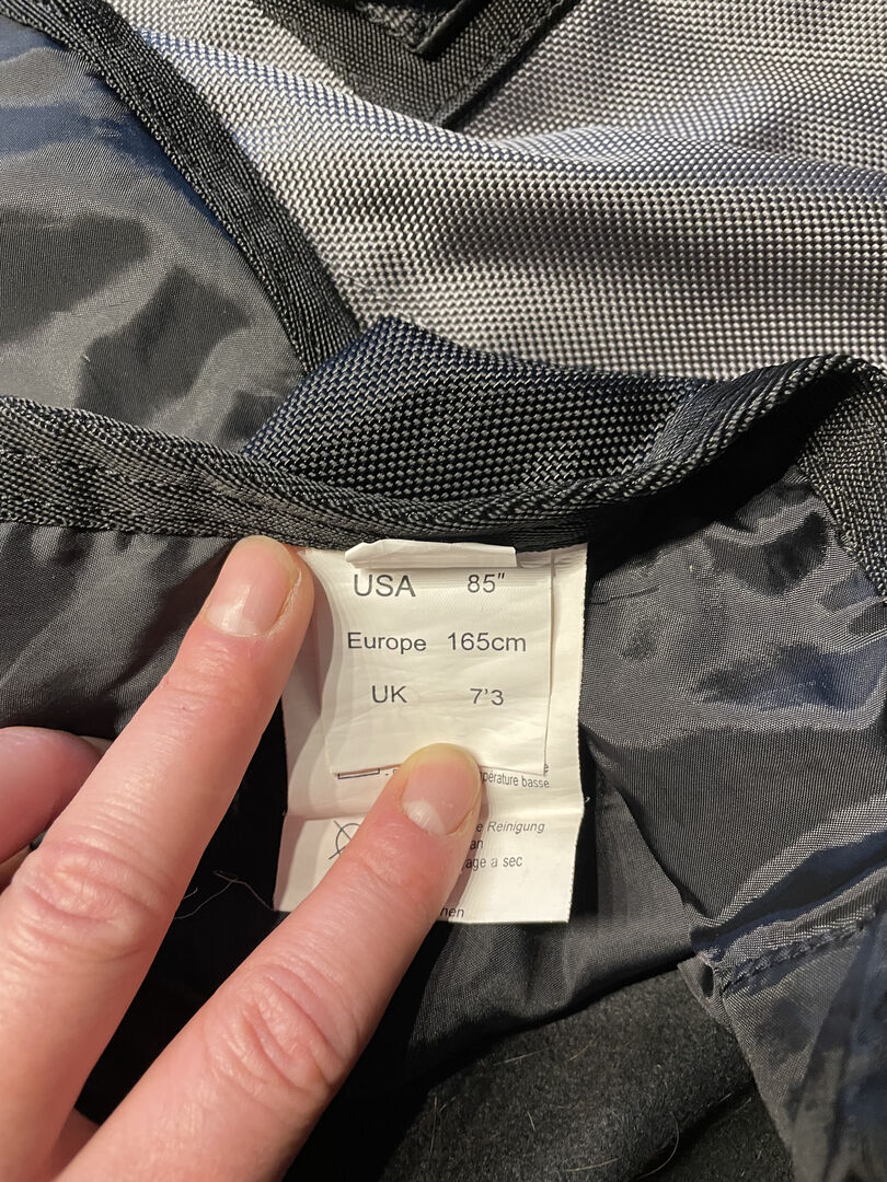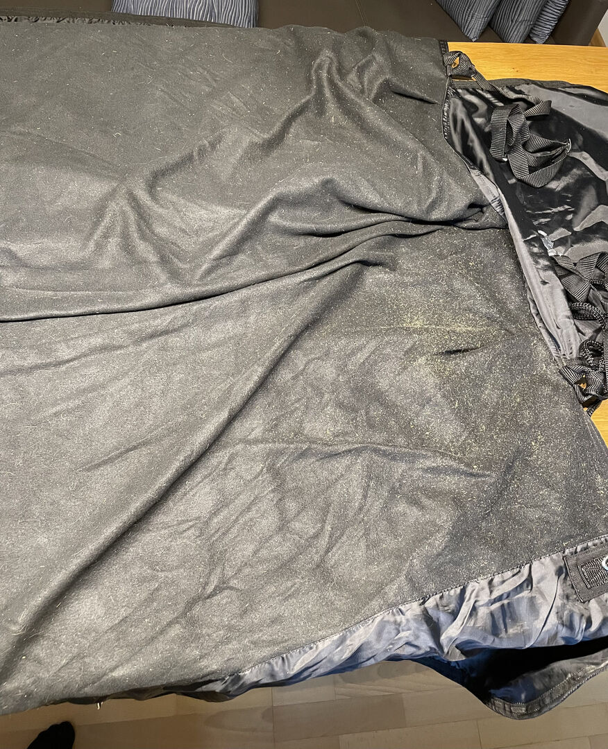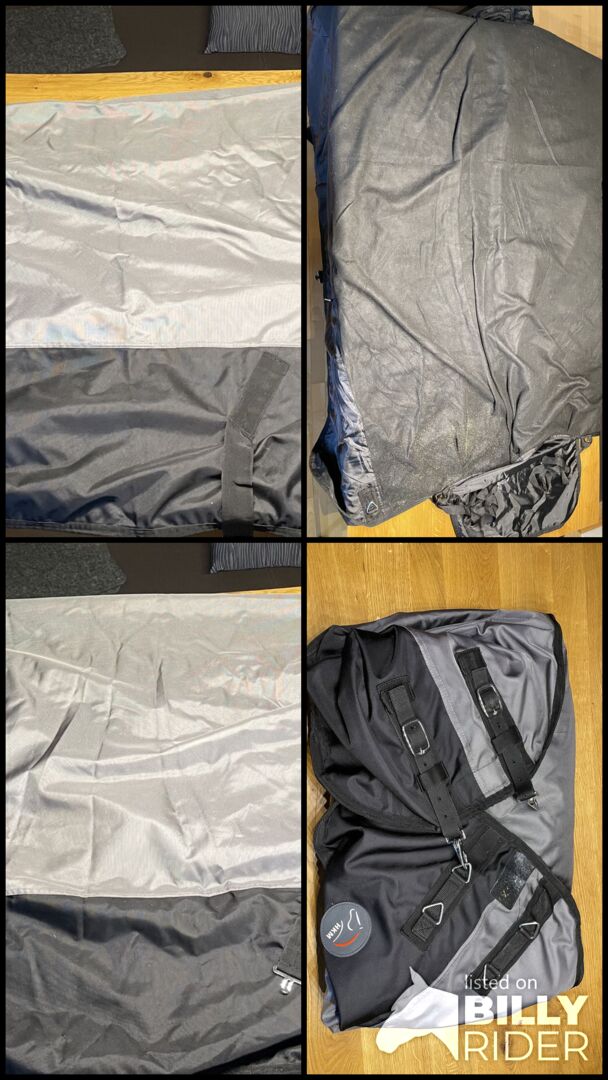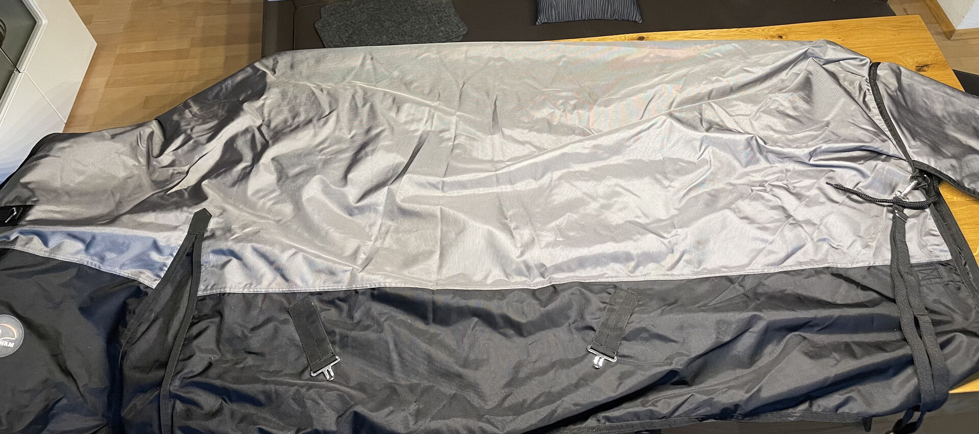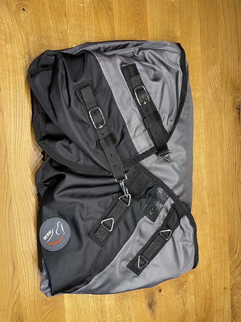 Outdoor filt Highneck 165 från HKM - Jag säljer min höghalsmatta, 1680D med fleecefoder, gråsvart från HKM storlek 165. Den har varit på hästen ungefär 5 gånger. Det finns några hårstrån och fluff inuti ullen. Absolut inga skador, den är som ny.