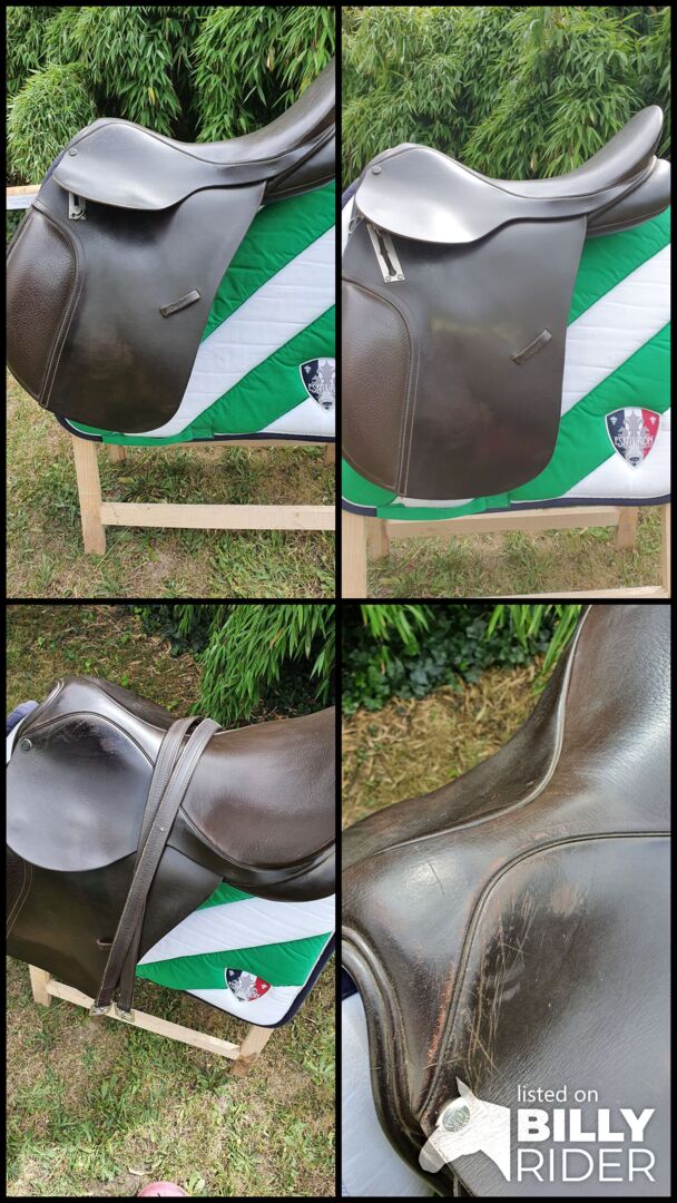 Ovanlig sadel - Till salu är en brun Despri-sadel från County med en smal sadelmage, som passar bättre för smala hästar. Det speciella med denna typ av sadel är den trevägsjusterbara sadelklaffen. Du kan snabbt och enkelt välja mellan den höga positionen för hoppning och den raka positionen för dressyr med hjälp av en justeringsskruv. Sadeln visar redan vissa tecken på användning (se foton). 160 cm stigbyglar i matchande färg och stigbyglar ingår.
