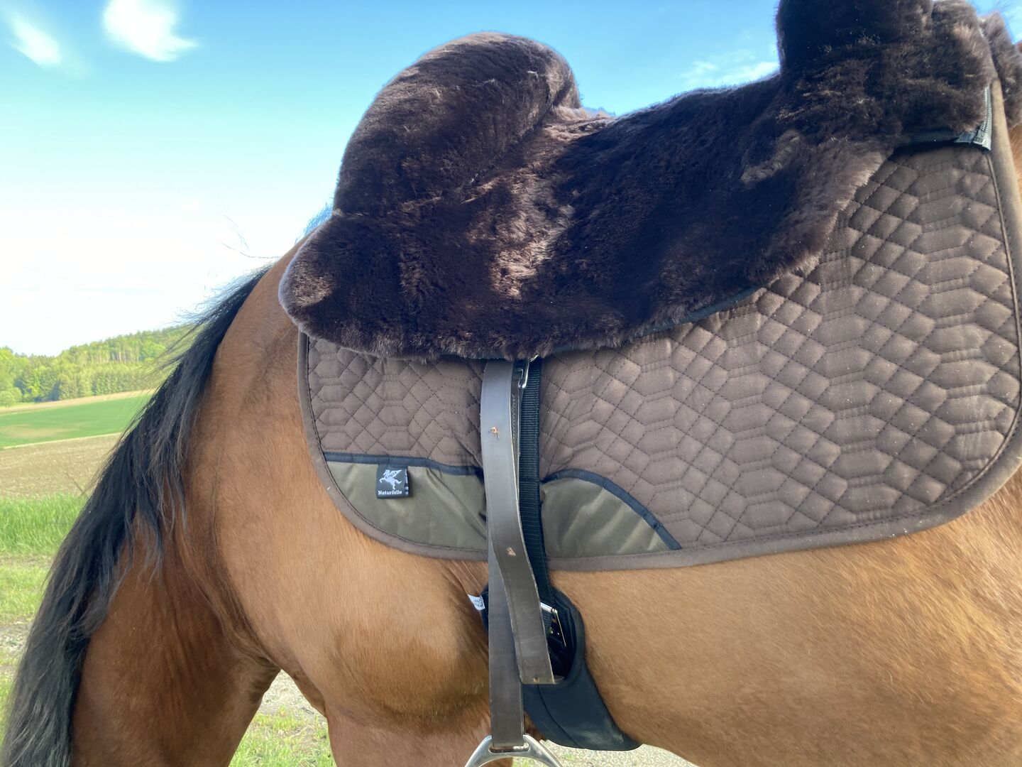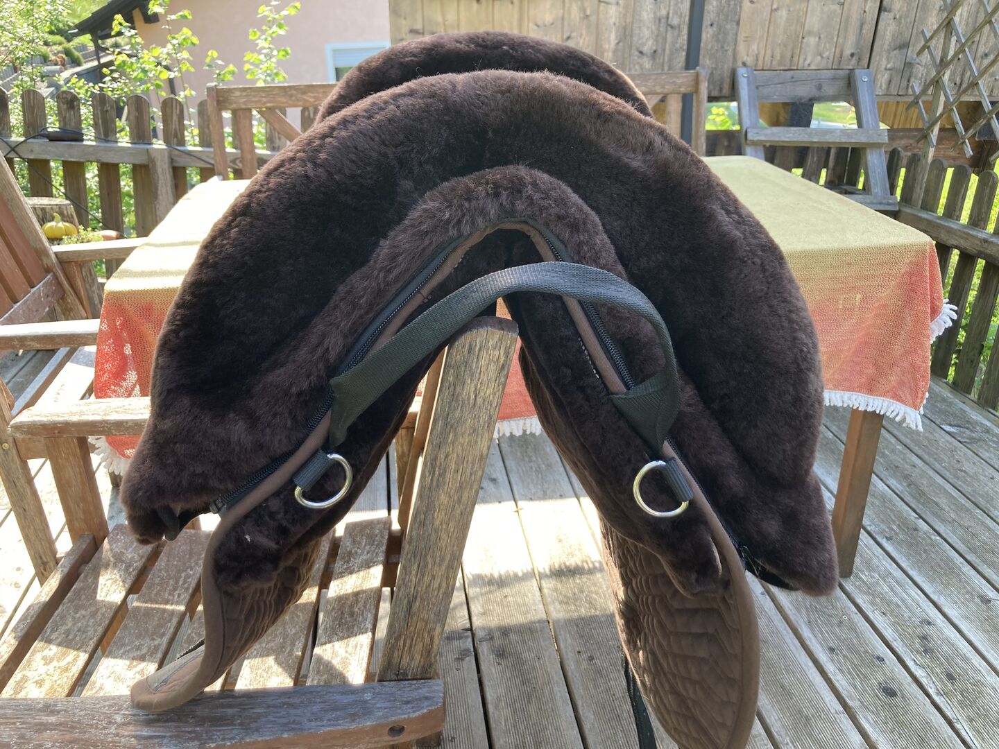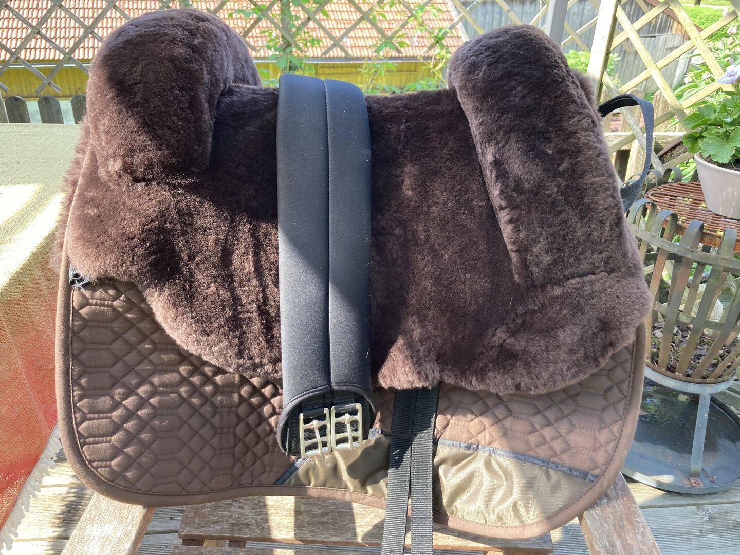 Pälssadel Färg Mocca - Angel hide sadel i nyskick, färg mocca. Sadeln köptes i maj 2021 till ett nypris på 315 euro och har endast använts 3 gånger. Pfiff soft short girth 70cm (NP 18,95 EUR) ingår. D-ringar för montering av stigbyglar finns tillgängliga.