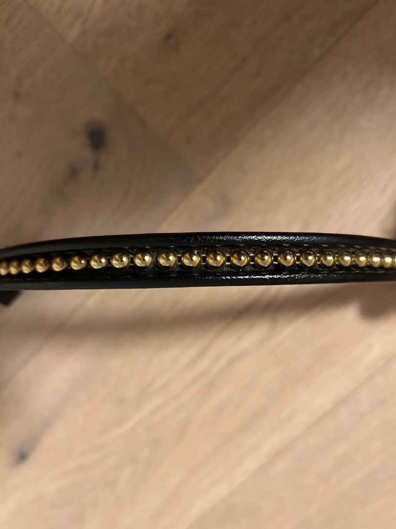 Pannband med guldpärlor - Jag säljer ett pannband i läder med guldpärlor i storlek Thoroughbred. Det har bara varit på hästen några få gånger och är därför som nytt.