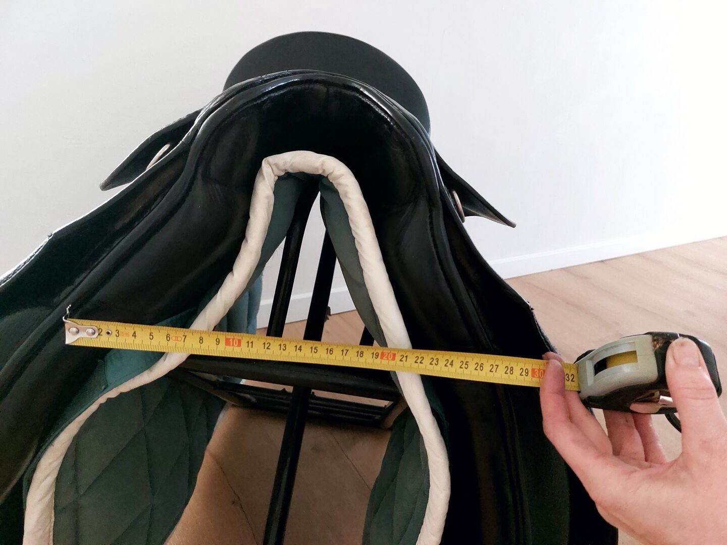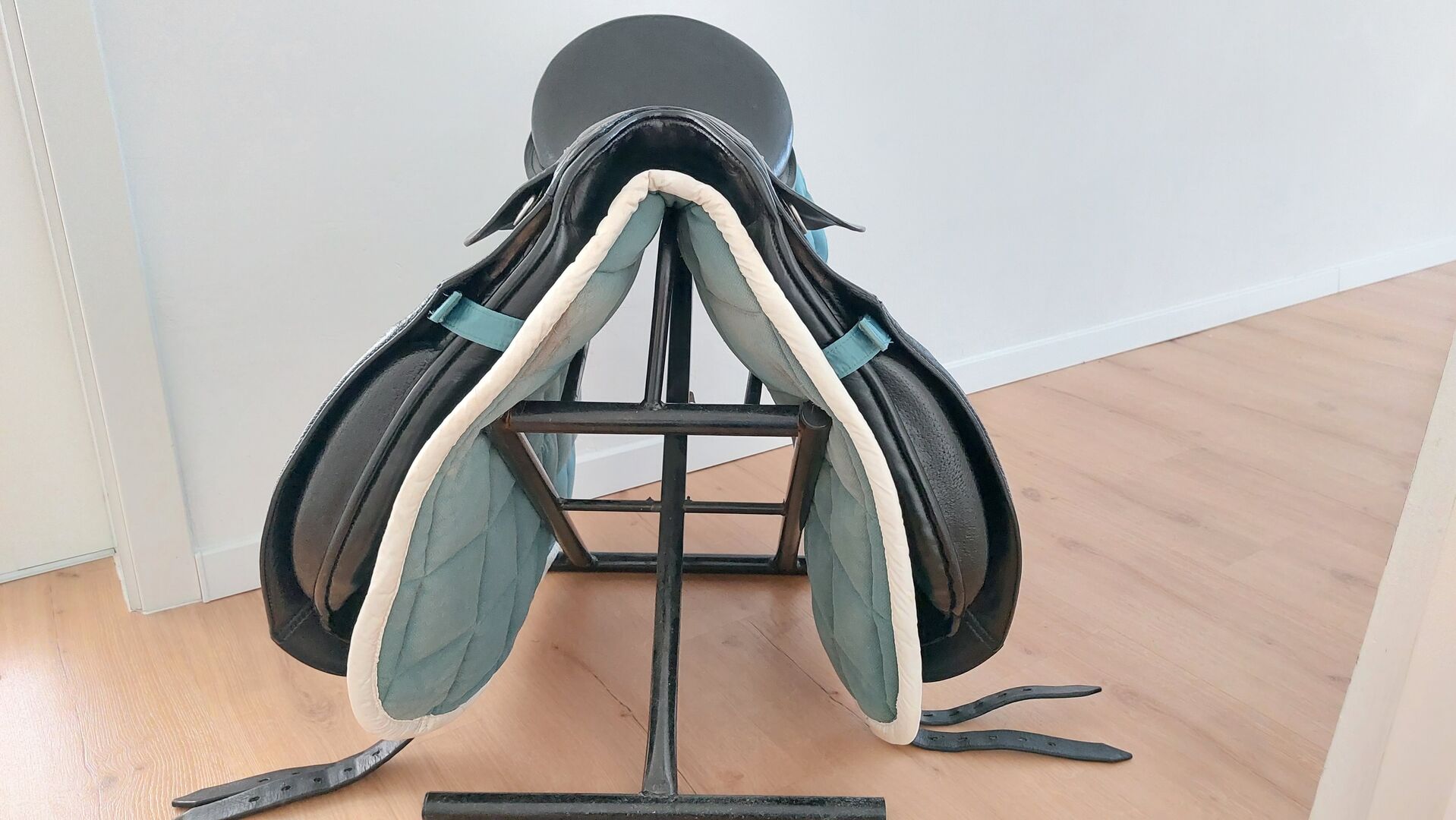 Sadeln har 3 paneler (2x lång, 1x kort) så att den kan ridas med en kort dressyrsadel eller en lång sadelgjord. Själv tycker jag om att rida med en lång grimma.