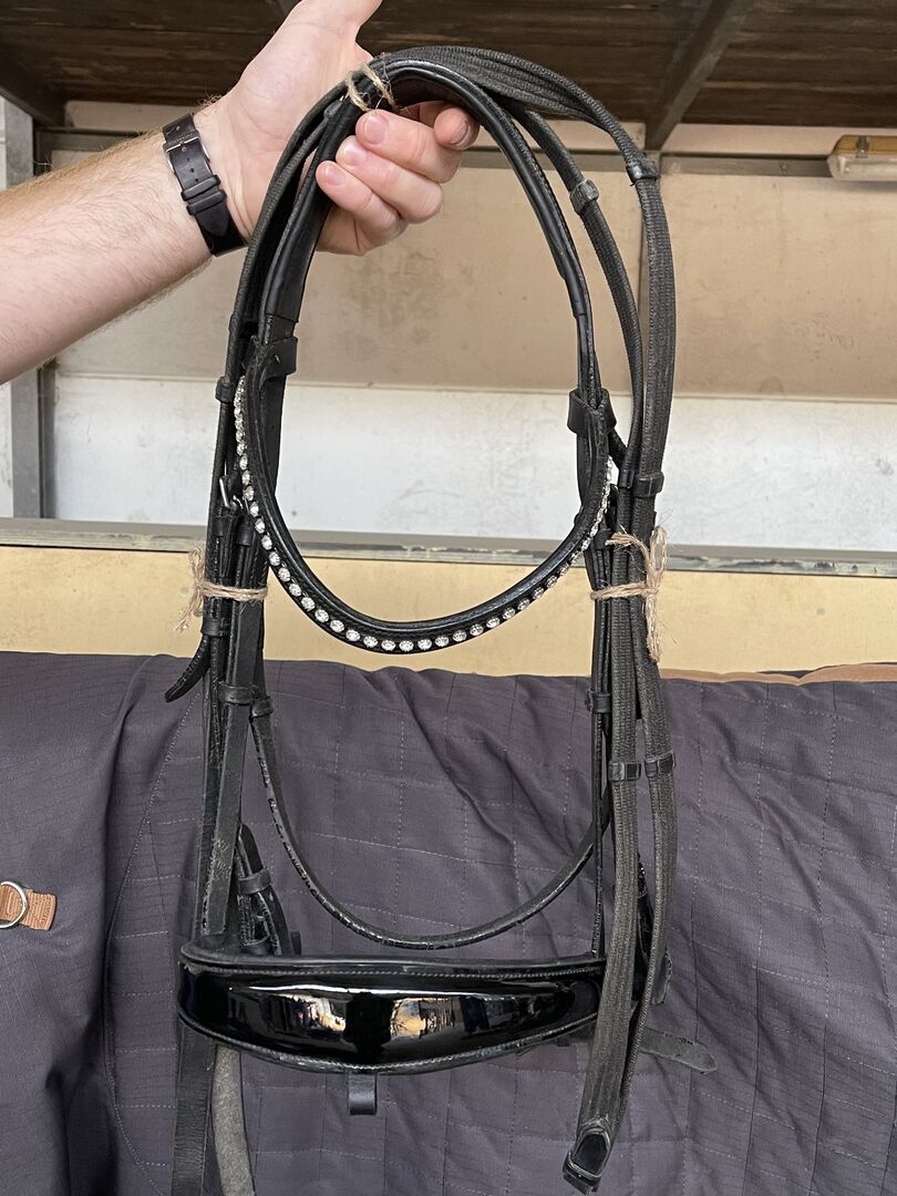 Gut erhaltene Trense WB mit Lacknasenriemen.