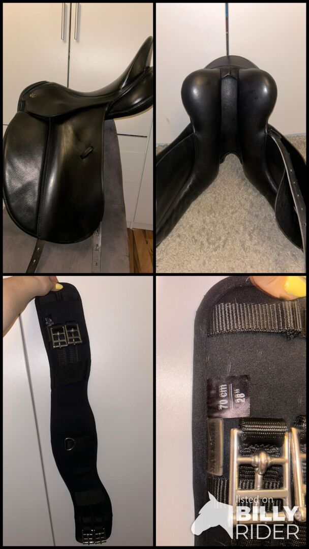 Den levereras med mjuka stigläder från Waldhausen med stigbyglar och en kort sadelgjord i månform 70cm med memory foam.