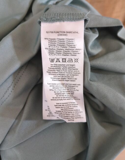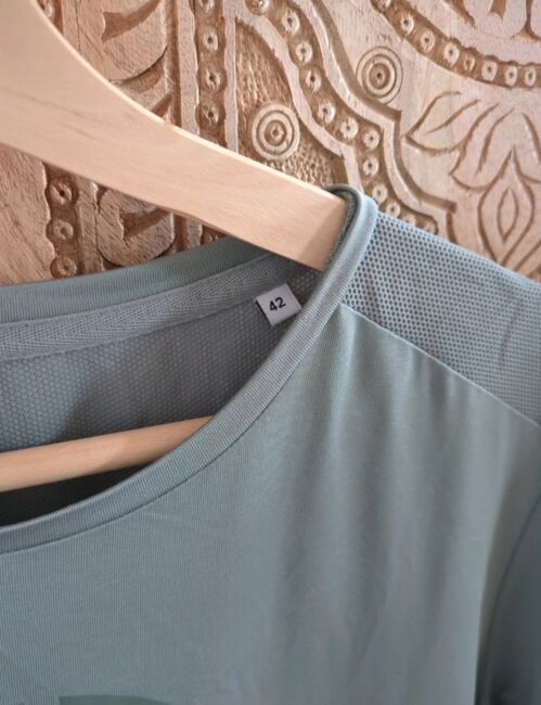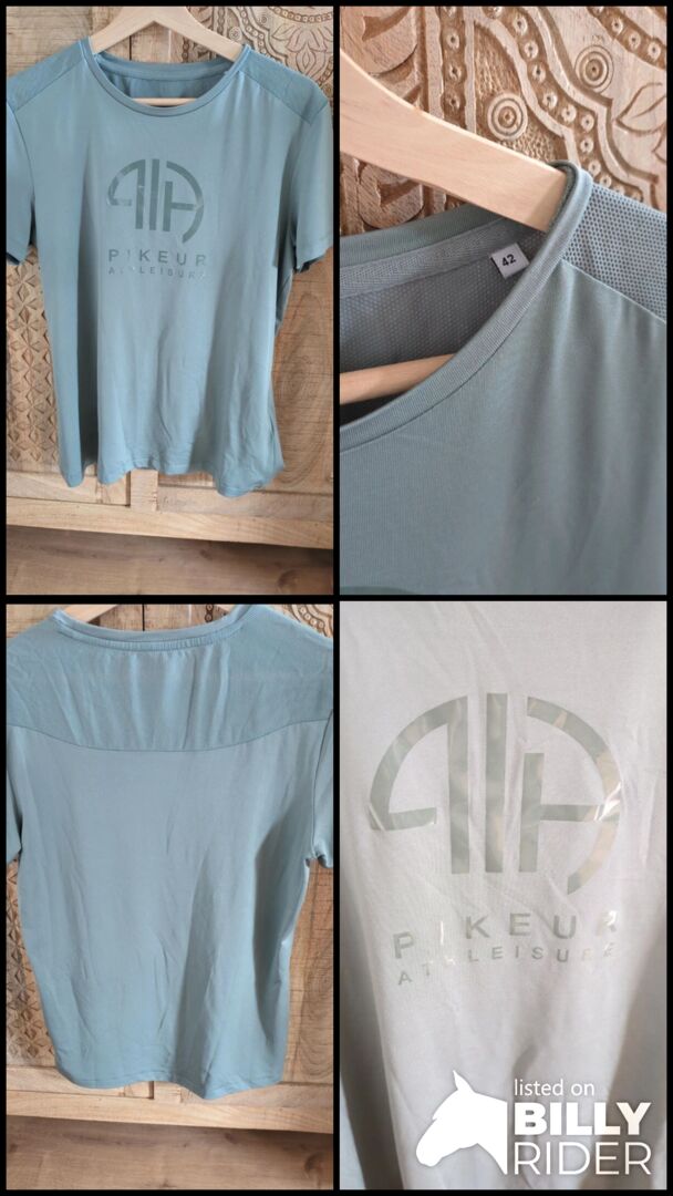 Pikeur funktionsskjorta Jade 42 athleisure - Funktionsskjorta från pikeur i gråblått, storlek 42 (faller mindre). Athleisure funktionsskjorta Jade från sommarkollektionen 2023 eller 2024, silikonprint på framsidan och vänster ärm, meshinsats på baksidan. Mycket bra skick, lite sliten och behandlad med försiktighet, alltid tvättad med milt tvättmedel och i tvättpåse. Färgen är en sval gråblå (2:a bilden passar bra). Ursprungligt pris 54€.