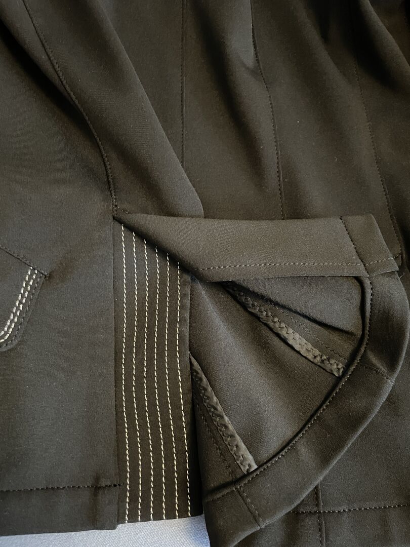 Snygg, figurnära turneringsjacka för damer från Pikeur med smal, åtsittande skärning. Jackan är tillverkad i superstretchigt jerseytyg, har en vacker cord-piping på kragen och sömmar i en kontrasterande färg. Dragkedjan är placerad under jackans knappslå.