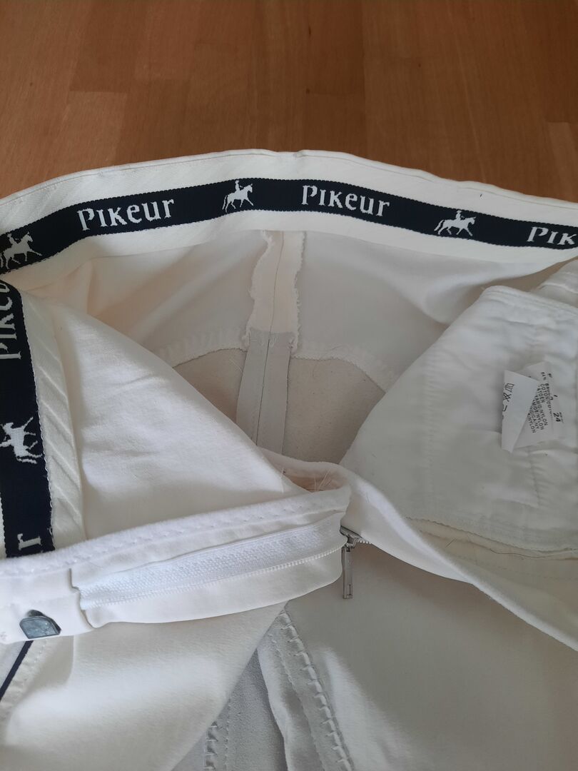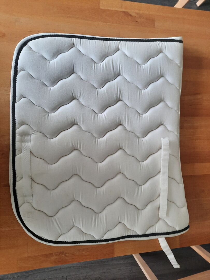 Pikeur turneringsbyxor med sadelkudde - Lite begagnade vita tävlingsbyxor från Pikeur med full sits i storlek 38. Byxorna har en svart rand på sidan. Kardborreknäppningarna är alla i ordning. Material: 64% bomull, 29% polyamid, 7% elastan. Liten svart missfärgning längst ner bak till vänster på kanten. Se foto Matchande vitt, tjockt dressyrschabrack med svarta ränder på kanten. Lätta tecken på slitage. Mycket fin matchande klänning för häst och ryttare.