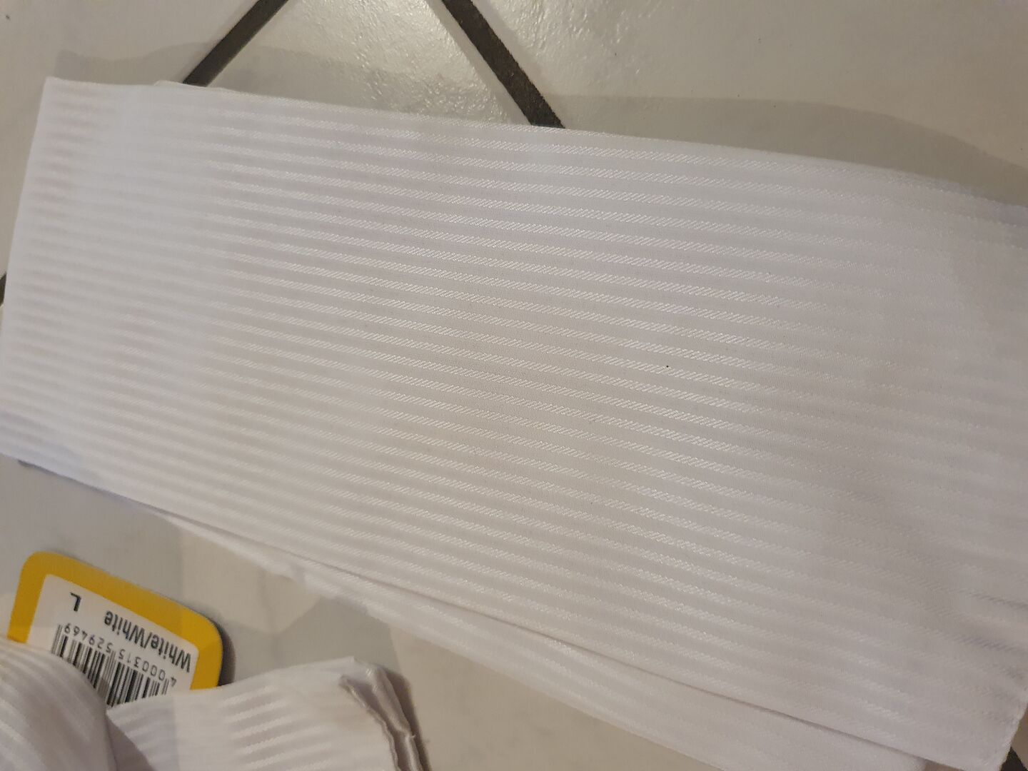 Ny vit plastron av tyg med randiga vävar.