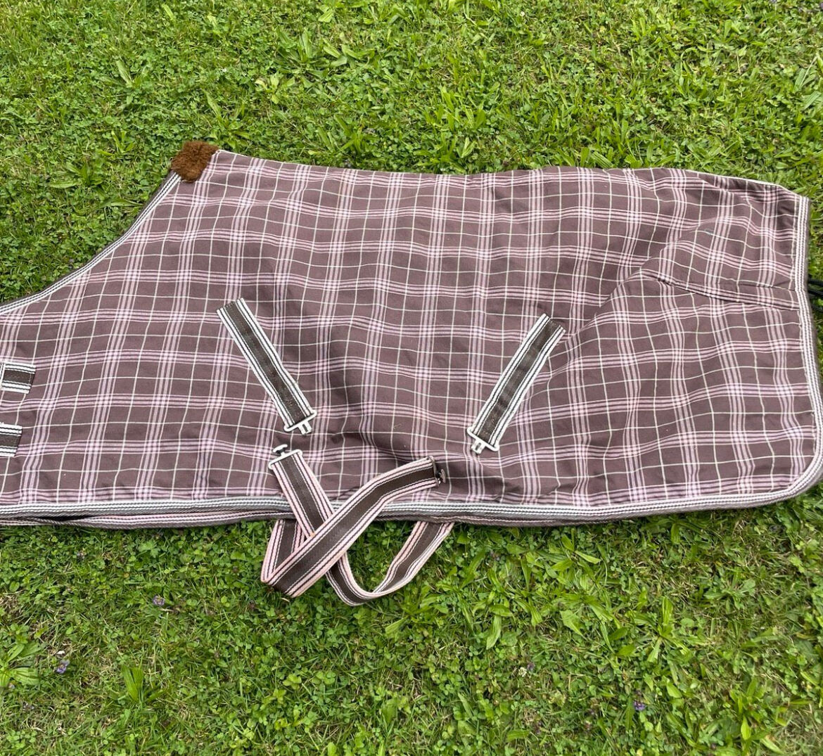 Ponny stallmatta transportmatta vintermatta 115cm - Till salu en brun/rosa rutig filt i storlek 115cm