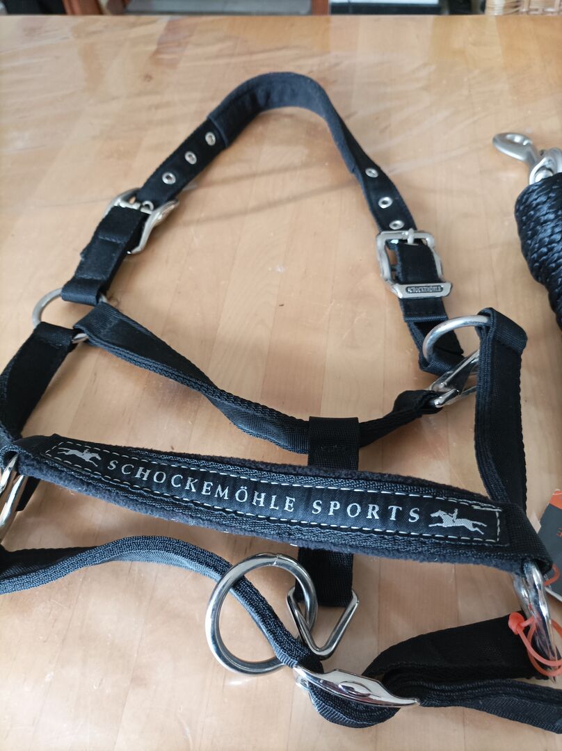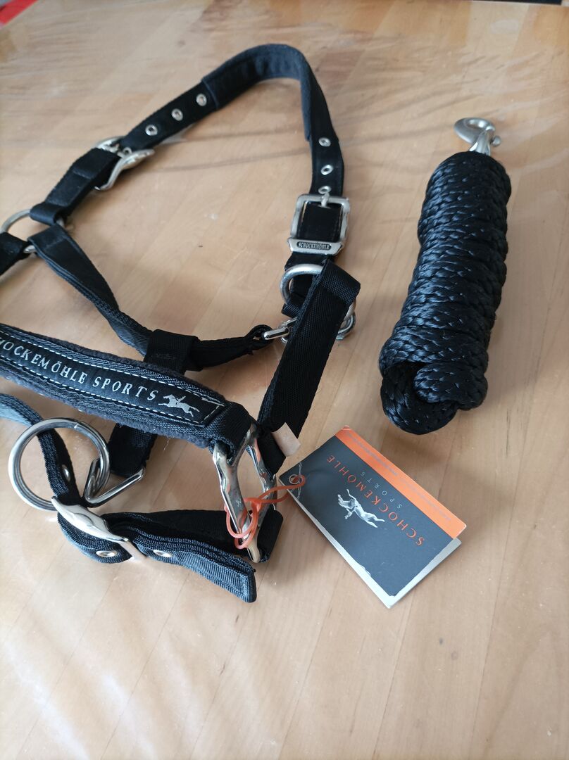 Ponnyhalster med rep ny - Jag säljer inte via betalningssystem. Till salu här är en helt ny och oanvänd halter av företaget Schokemöhle utan defekter haltern är vadderad på pannan och dimensioner uppsättningen består av halter och rep.