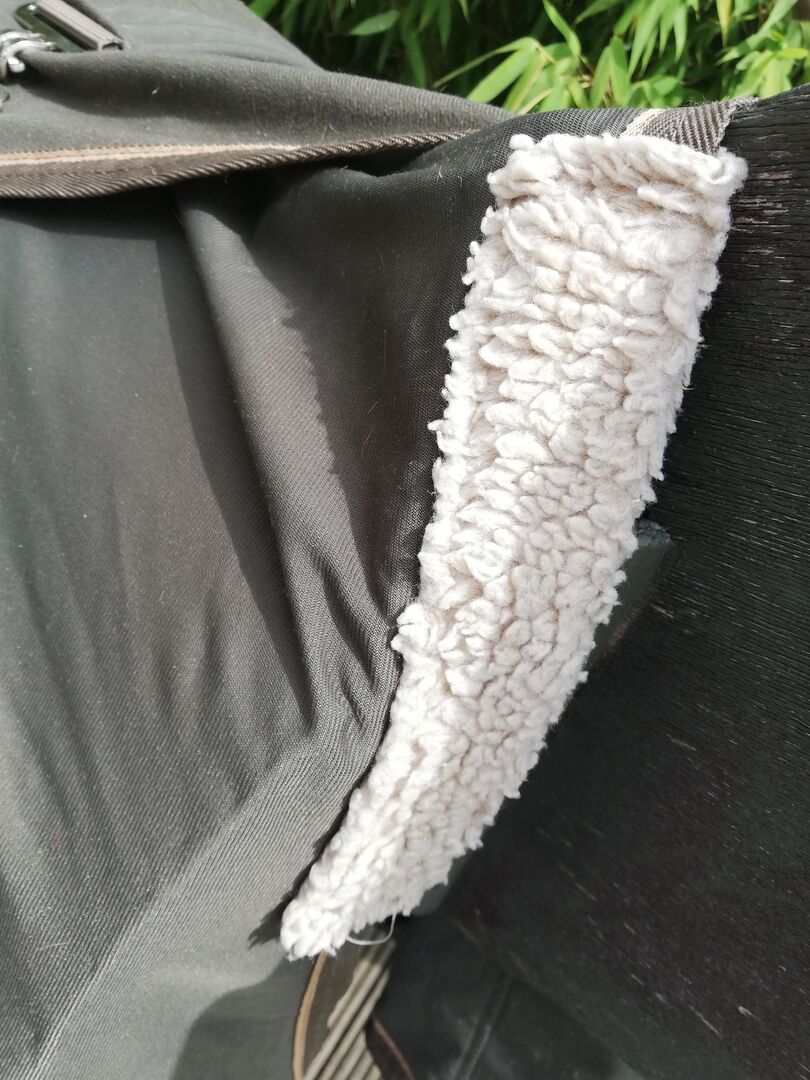 Pony filt storlek 115cm övergångs filt - Täcke i olivgrönt, bekvämt att bära, utan gångspalt, bekväm stängning framtill med kardborreband, korsviste. Tvättad.