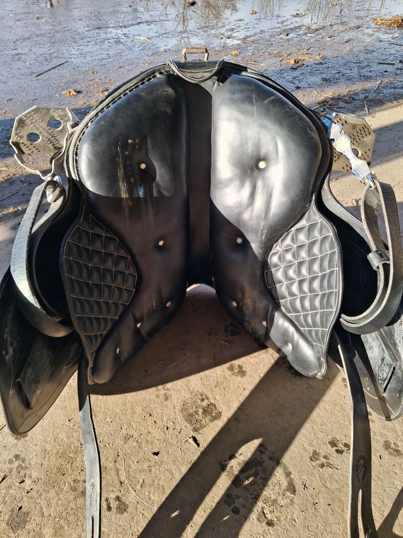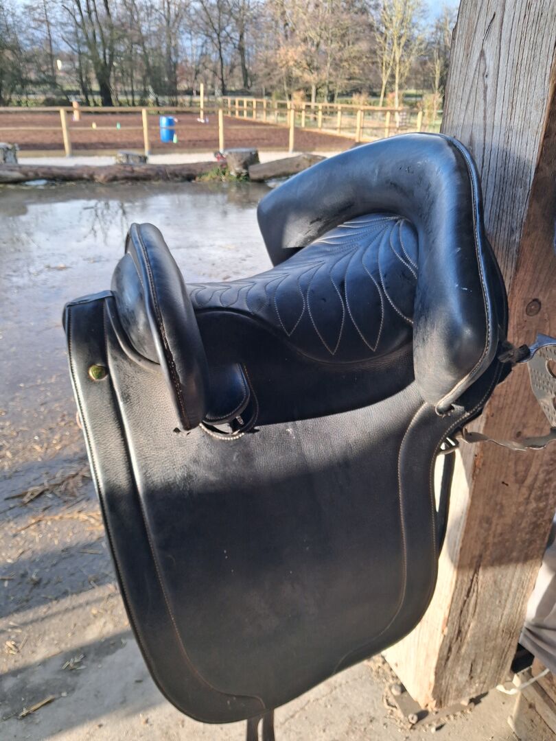 POTRERA ARBETSSADEL FRÅN MARJOMAN - Jag har köpt min lite begagnade ARBEITSSATTEL som passar perfekt för arbetsutrustning eller utställning. Genom den termoverformbara Kopfeisen passar den sig optimalt an den Körperbau Ihres Pferdes an. Mycket vackert bearbetad i svart läder med påtaglig stickning. Der Sattel kostet neu rund 1500 Euro . Jag har använt den mycket och har gett den en rabatt på 790 EURO.
