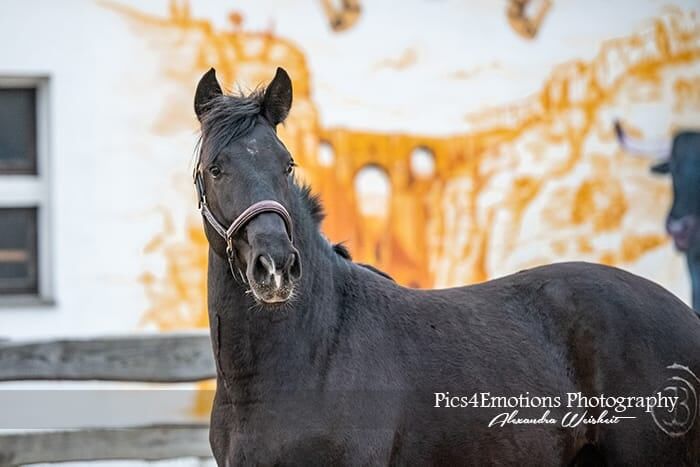 PRE ung hingst - Denna renrasiga PRE-svarthingst blir tre år gammal i juni. Han kommer att nå en sluthöjd på cirka 1,60 meter. Han har haft en stabil uppväxt med artfränder och är socialiserad, känner till fölets ABC och väntar på ytterligare uppgifter.