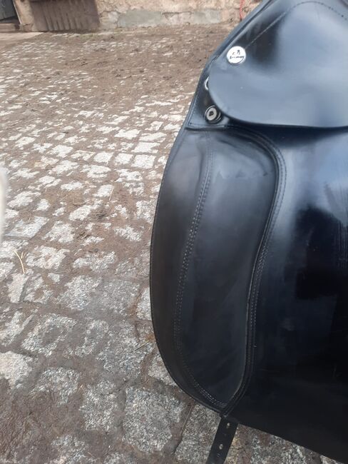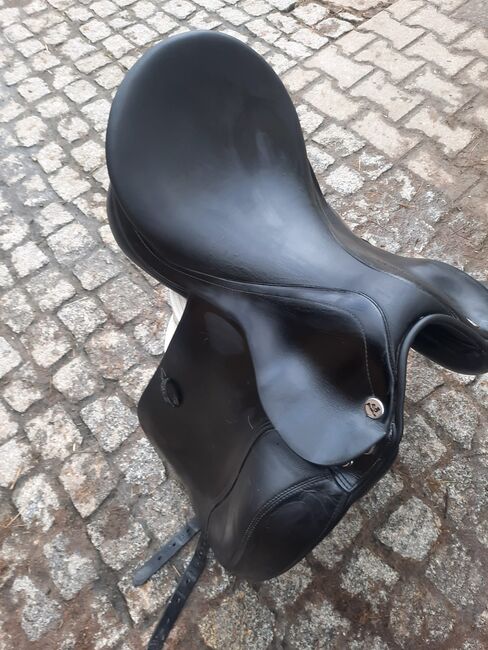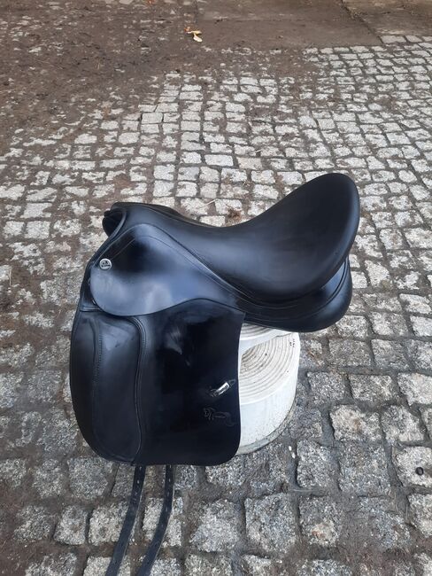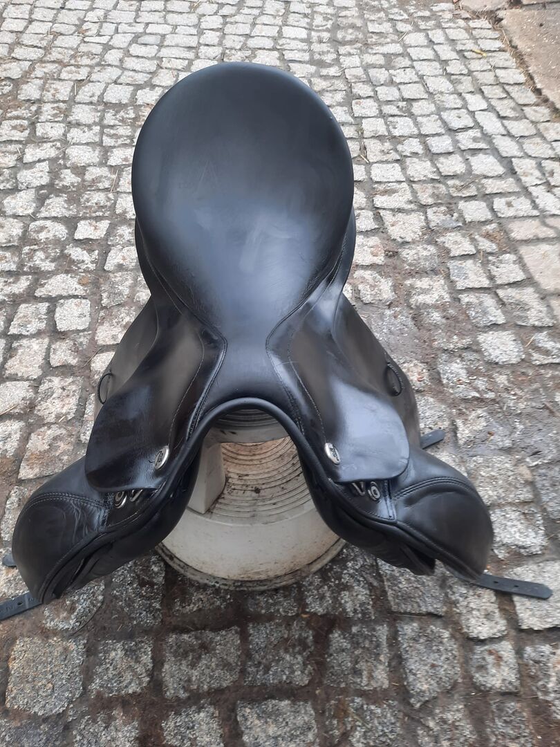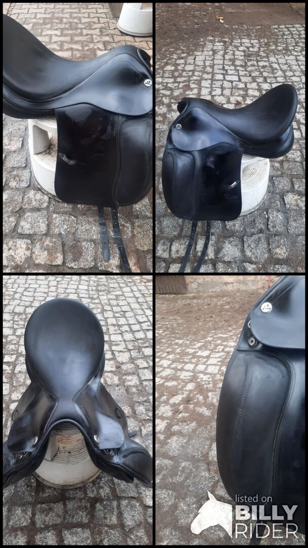 Prestige Dressage Sadel Academy - Till salu vacker djup och korrekt passande dressyrsadel från Prestige Model Academy. Med kardborreknärullar, sadelgjord, bred svängbar kanal. Kammare 32 Sittplats 17