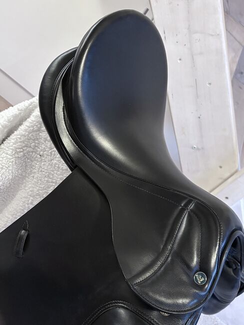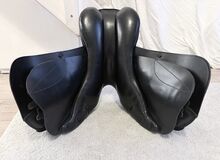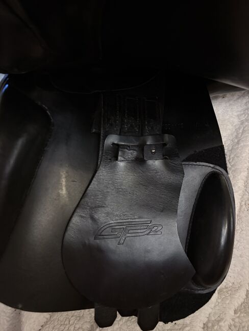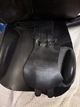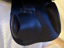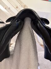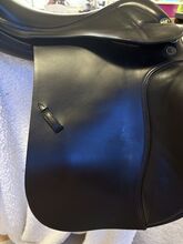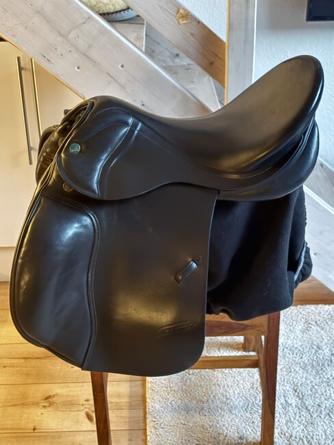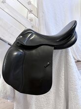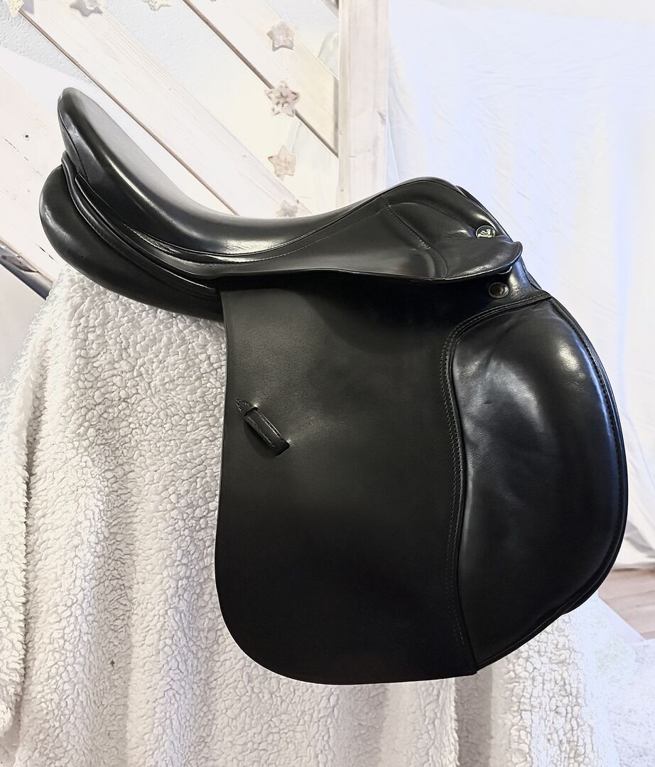 Sadeln visar knappt några tecken på användning och lädret är smidigt och välvårdat. Den ergonomiska formen ger optimal komfort för både ryttare och häst.