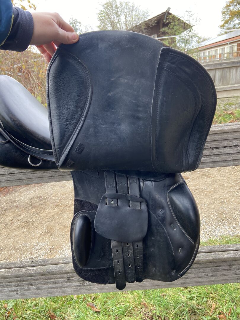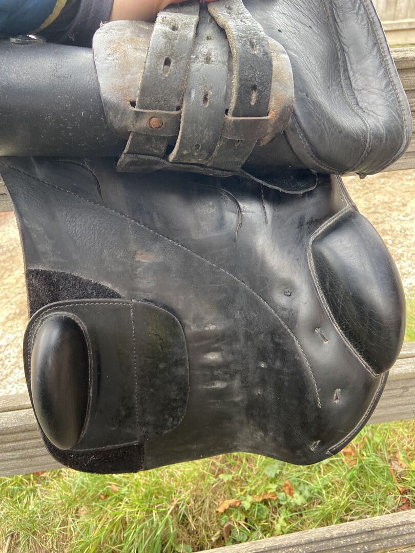 Sadeln är äldre, men stoppningen är fortfarande mycket mjuk! Knärullarna är också mycket mjuka och sköna. De bakre knäskydden under sadelklaffen kan enkelt tas bort tack vare kardborreknäppningen.