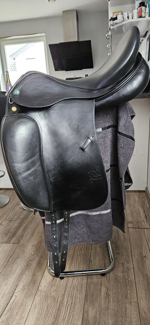 Till salu är en premium dressyrsadel från Prestige i toppskick. Prestige Top Dressage har en sitsstorlek på 18 (Prestige tenderar att vara ganska liten, jämförbar med 17,5 tum från andra tillverkare), med den ursprungliga kammarbredden på 32, som kan justeras oändligt av sadelmakaren och tillverkades 12/2017.