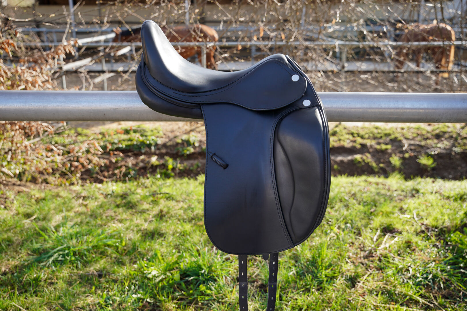 Sadeln levererades med en kotbredd på 33 och har stramats en gång av sadelmakarmästaren. Fakturan finns tillgänglig för både köpet och monteringen (justering av sadelkammare och stoppning).
