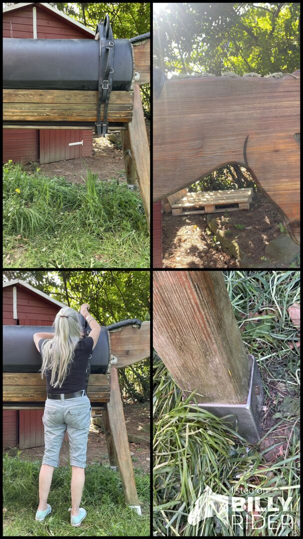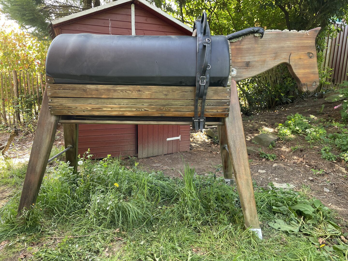 Professionell valvhäst av trä Otto - Jag erbjuder den unika professionella Voltibock Otto från Voltigierbock.de. Efter en lång karriär inom idrotten har han tagit en paus i trädgården, där han har gjort många barn glada. Men han är helt enkelt för bra för att gå i pension på grund av sin goda kvalitet. Jag ska byta ut en läkt på magen. Den är dock redo för omedelbar användning. Hjulen sitter fortfarande kvar. Däcken är dock punkterade. Den kan lätt flyttas av två personer om man inte vill att den ständigt ska ändra position. Den är dock superstabil och kan lätt bära flera Voltis på ryggen. Jag hämtade honom med en öppen släpvagn på den tiden. Otto säljs utan sele. Klädseln har bytts ut en gång under sin livslängd och är i mycket gott skick bortsett från några ytliga slitage.