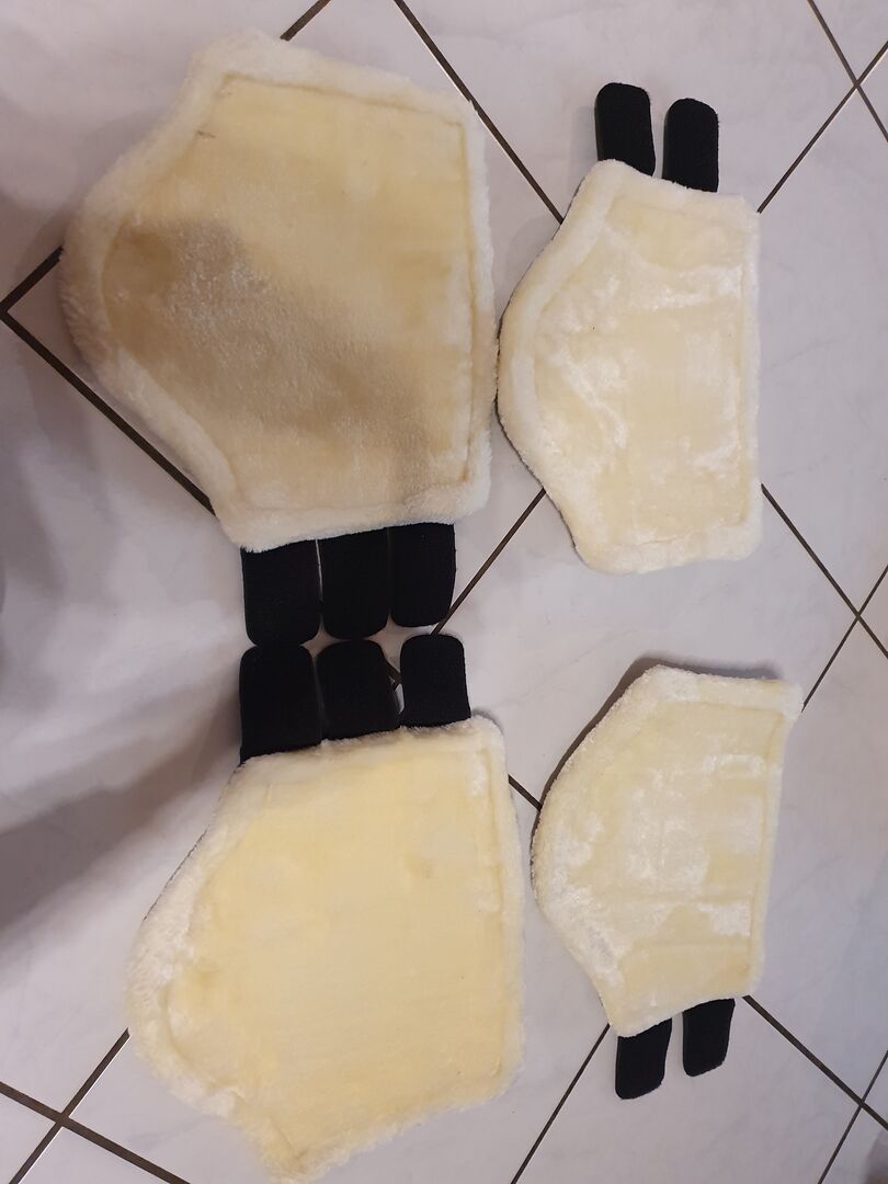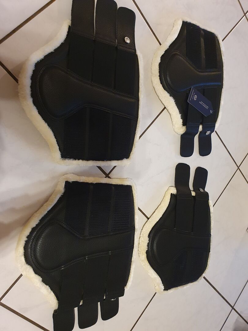 PS of Sweden damasker COB nya - Säljer ett oanvänt set med 4 damasker i storlek Cob. De är svarta, utsidan är gjord av läderimitation, insidan är gjord av ljus pälsimitation. De främre damaskerna stängs med 2 kardborrar vardera och de bakre damaskerna har 3 kardborrar vardera. De fanns inte i stallet och packades bara upp för fotot. Tyvärr är de för små för min häst, jag har jämfört dem hemma med stövlar som passar perfekt.