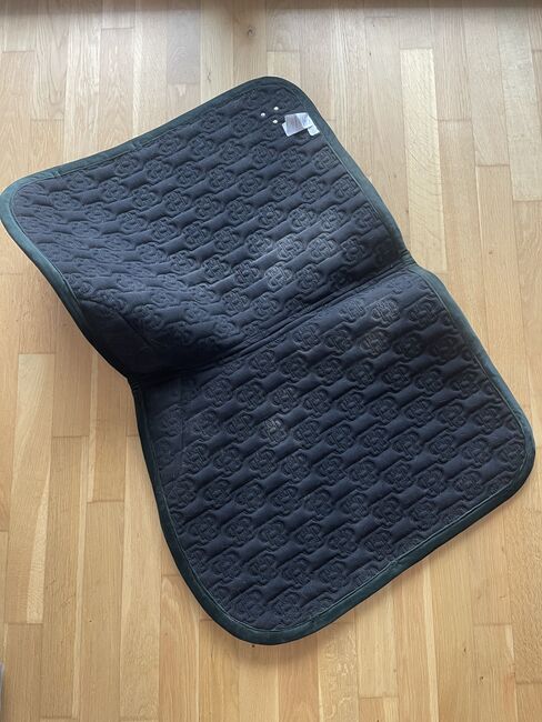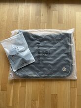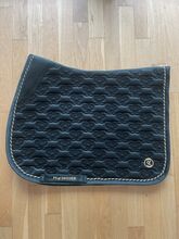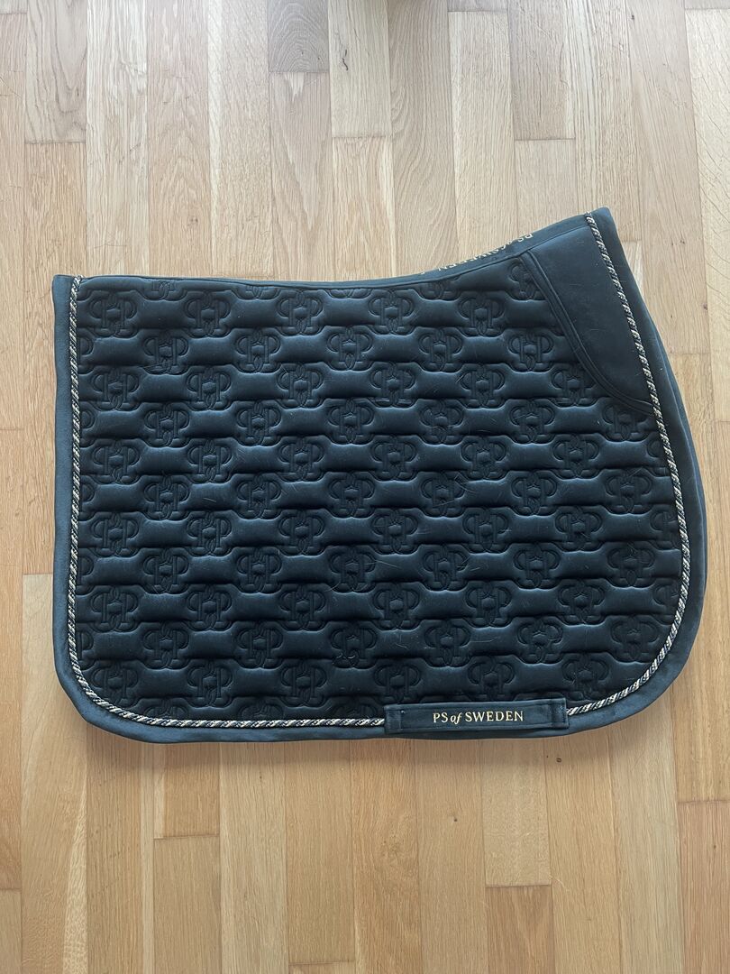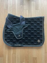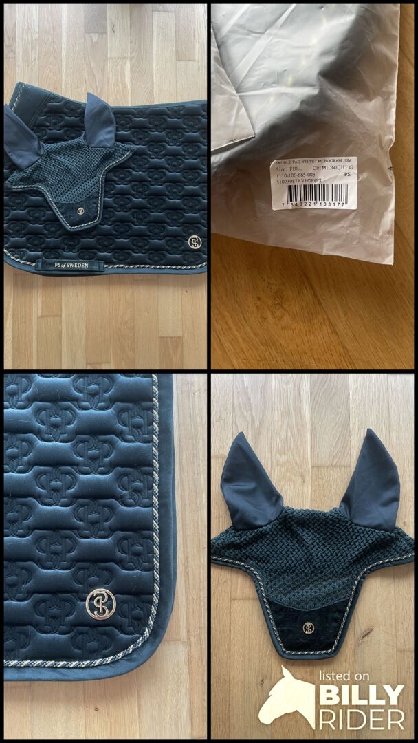Två gånger använt PS of Sweden Velvet Monogram Set i Midnight Green. Sadelunderlägg för hoppning och flughätta. Inga defekter. Schabraket har bara borstats och inte tvättats, så det har några hårstrån på sig. Men har inte ridits svettig. NP 80€ sadelunderlägg och 50€ fly bonnet.