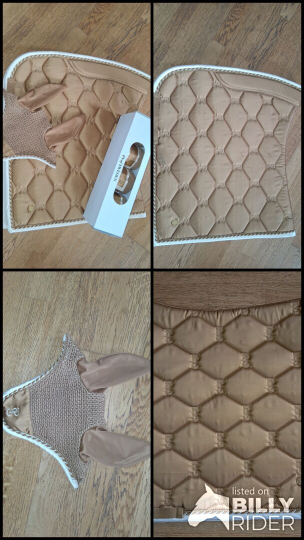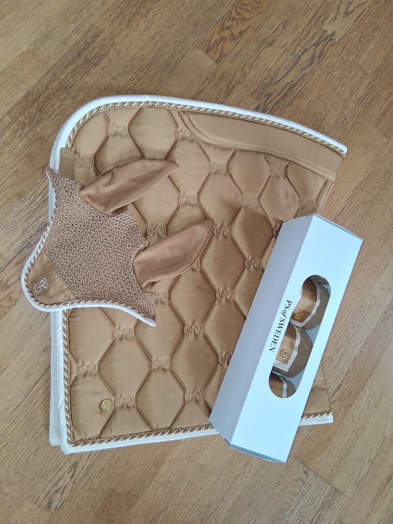 Dressurschabracke von PS of Sweden in der Farbe gold mit gold-weißen Zierkordeln am Rand mit passenden Bandagen und Fliegenhaube. Alles wie neu.