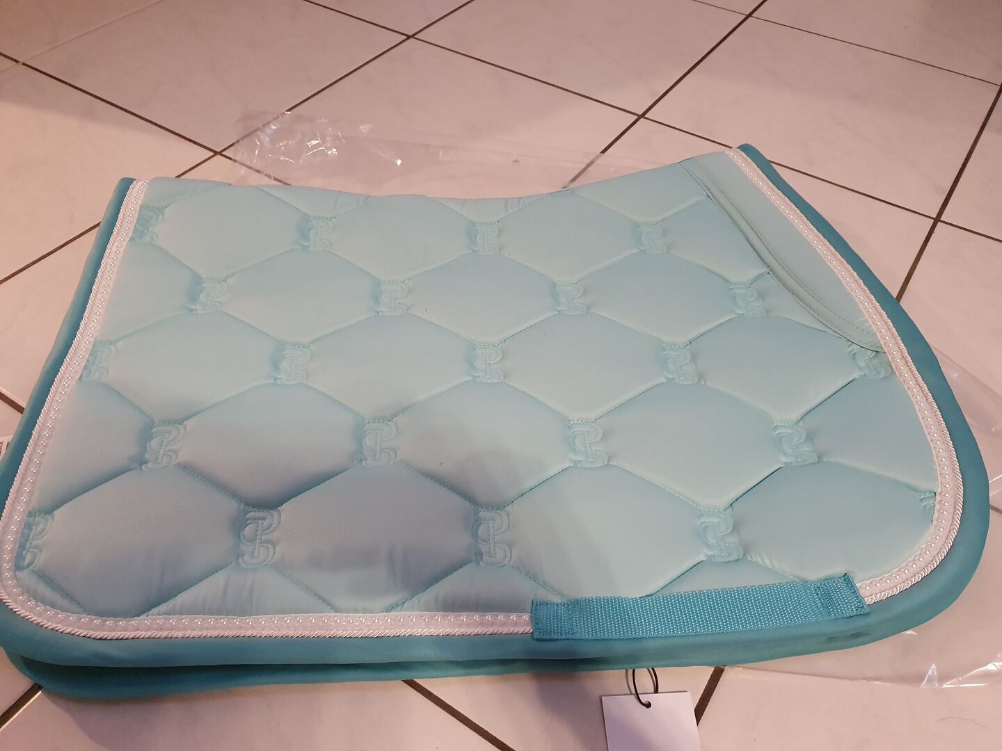 PS of Sweden Sadelunderlag för hoppning - Jag säljer min oanvända sadelunderlag för hoppsadel i färgen ljus turkos, eftersom jag faktiskt inte använder hoppsadeln längre och därför inte behöver lagra så många sadelunderlag. Den har en ljus turkos, slät övre tygdel, en bård i mörkare turkos och en vacker vit bård med dekorativa pärlor emellan. Undersidan är svart. Istället för de vanliga övre sadelunderlagen har det här sadelunderlaget en pärla framtill som håller sadelunderlaget på plats.