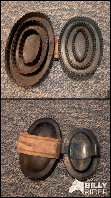 Putsning av harv - Blå curry comb mini i gummi och glitter, svart i metall. Båda begagnade och aldrig använda. Leverans möjlig i Berlin-området, annars plus frakt.