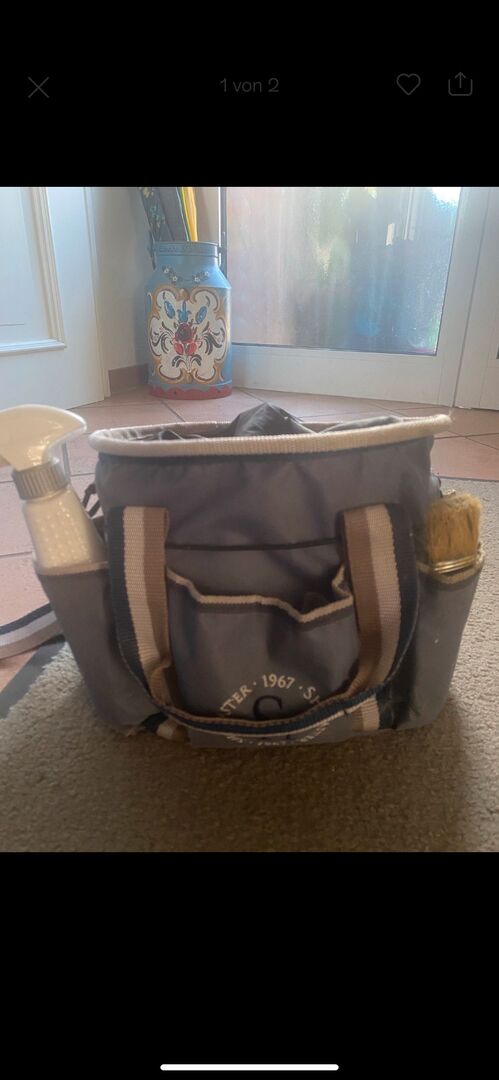 verkaufe eine putztasche mit sehr viel zubehör. mähnen und fliegenspray, ca 9-11 bürsten dabei.