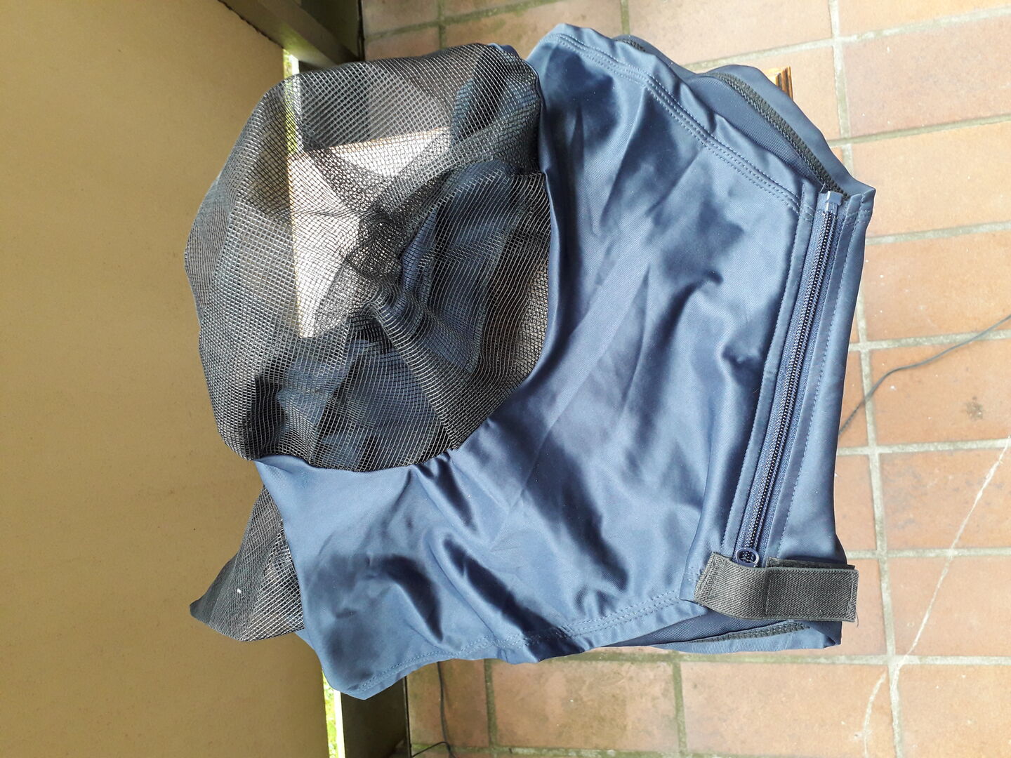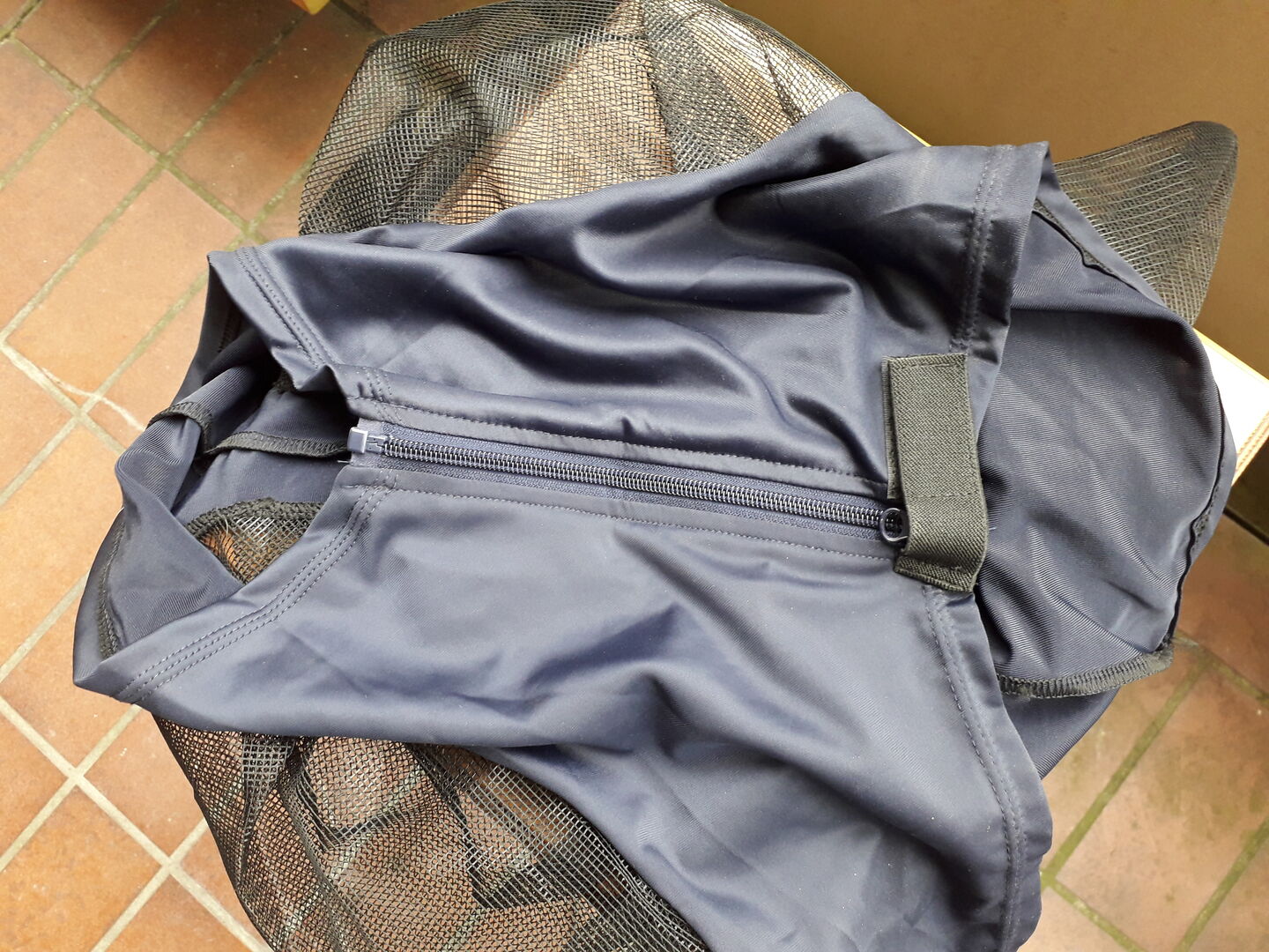 Ögonen och öronen på flugmasken är gjorda av ett luftgenomsläppligt meshtyg. Masken kan enkelt stängas med en dragkedja på undersidan.