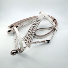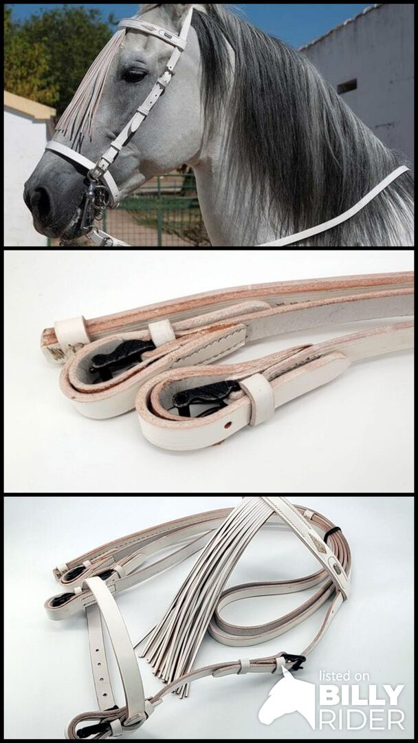 REA! Exklusivt handsytt spanskt träns i vitt med vaquero tyglar MARJOMAN - Vackert spanskt träns handsytt i Spanien (säljs utan bett) storlek WB inklusive vaquero tyglar. Tillverkat av topp EU läder. Med flugfransar och broderi i pannbandet. Tyglar med en skjutbar läderflik. Tyglarna är ihopsydda i slutet till ca 37 cm. Total längd ca 320 cm / enkel längd ca 160 cm, bredd ca 19 mm.