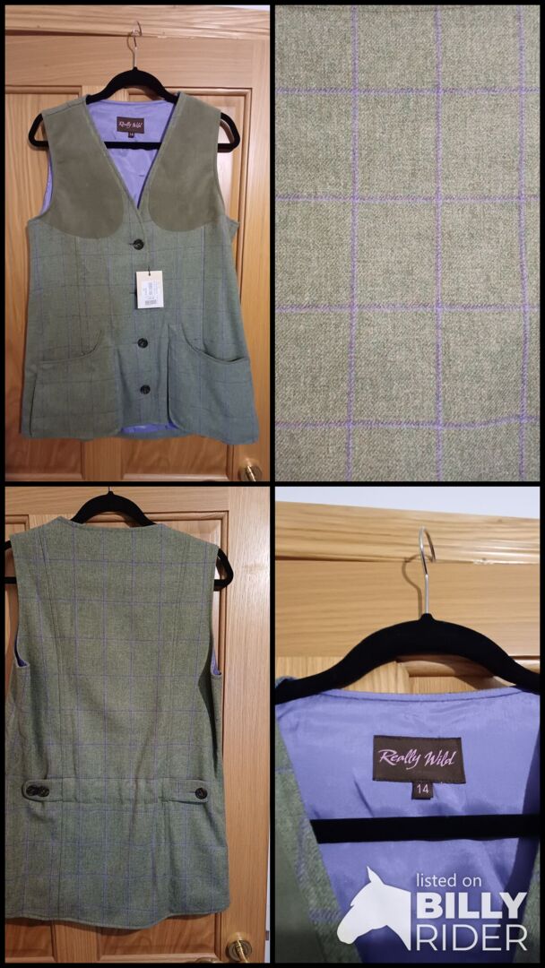 This Really Wild women's waistcoat has never been worn. The tweed is light green with a light purple hatch.