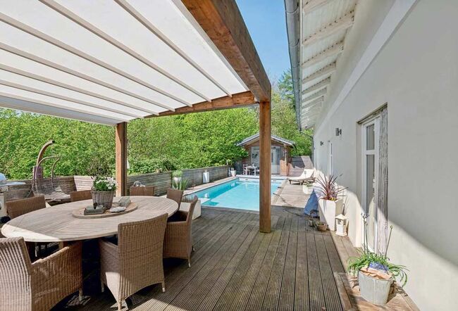 Ref2554 Schleswig Holstein, Landkreis Plön, Giekau - Villa med häststall till salu! - Elegant privat fastighet till salu i ett lugnt läge för hästälskare! 🔸~ 21 556 m2 tomt 🔸ca. 192 m2 plus 45 m2 utbyggnadsreserv på övervåningen, bygglov för en mormorslägenhet på övervåningen finns, vardagsrum 40 m2, stort elegant lantkök, 2 kontor, stort sovrum, badrum med runt badkar 🔸Saltvattenpool med terrass och täckt grillplats, bastuhus med dusch och avkopplingsrum 🔸240 m2 stallbyggnad, sadelkammare, foderförråd, saltlösning för inandning, 480 m2 verkstad, ca 1.100 m2 paddock/ridbana 🔸Biotopdamm, betesområden, skogsområde, öppet stall för upp till 8 hästar, vinterpaddock