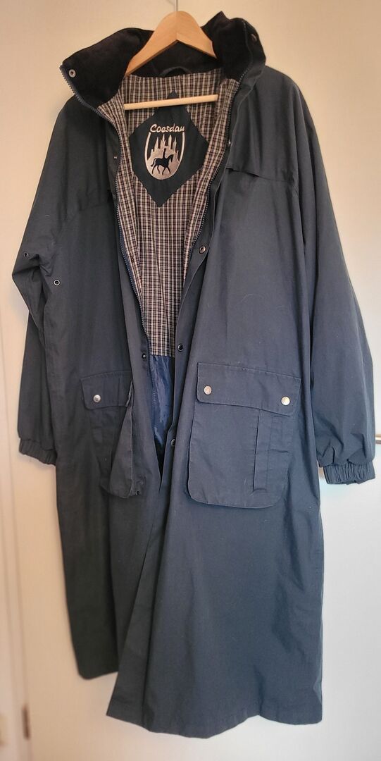 Regnridrock - Loesdau regnridrock, blå, ca storlek L (etiketten finns inte längre i rocken). Huvan kan enkelt förvaras i kragen. Insidan av kragen är gjord av mjuk manchester, justerbara manschetter på ärmarna, ridspalt baktill som snabbt kan aktiveras med en tryckknapp. Mångsidiga möjligheter att förvara viktiga föremål: 2 stora framfickor, var och en med 2 tryckknappar upptill, fickor med slits i sidan. Det finns också en bröstficka på insidan som kan stängas säkert med dragkedja. Meshinsats baktill för god ventilation, se foto. Reflexband på ryggen för säkerhet, benslingor på båda sidor för ryttarens lår för säker passform i väder och vind, fästs med kardborreband - håller mycket tillförlitligt. 2-vägs dragkedjan framtill är helt intakt och okänslig och täcks också av ett vindskydd. Mycket bra skick, nytvättad och vattentät.