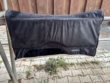 Svart, kvadratisk korrigeringspad med päls på undersidan och mikrofiber på ovansidan. Denna westernpad är utvecklad för hästar med drop back för att minska överbryggning genom sadeln och förbättra sadelns passform. Hästar med sned rygg (det kan vara unghästar som är överbyggda i ryggen, hästar med kort rygg och äldre hästar) behöver en pad för att fylla gapet mellan ryggen och sadelgjorden. Detta gör att ryttarens vikt fördelas optimalt på hästens rygg och förhindrar tryckpunkter. En 1,5 tum tjock skumvaddering har använts i mitten av den här dynan, som blir tunnare framtill och baktill för att förlänga sadeln framifrån och bakåt. Förlänger sadeln från fram till bak och fyller ut eventuella luckor.