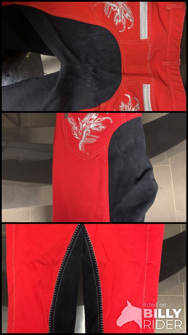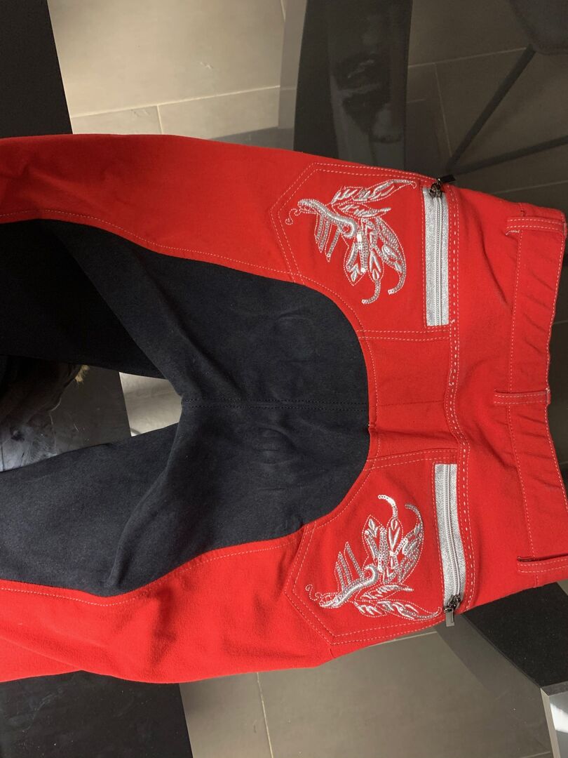 Hej Jag säljer mina vackra Montar breeches i rött med silver dekoration på sätesfickorna de är i barnens storlek 12 men jag bar dem med en storlek 34 och en höjd av 1.62m och de passar perfekt jag bara bar dem ett par gånger fler bilder tillgängliga på begäran