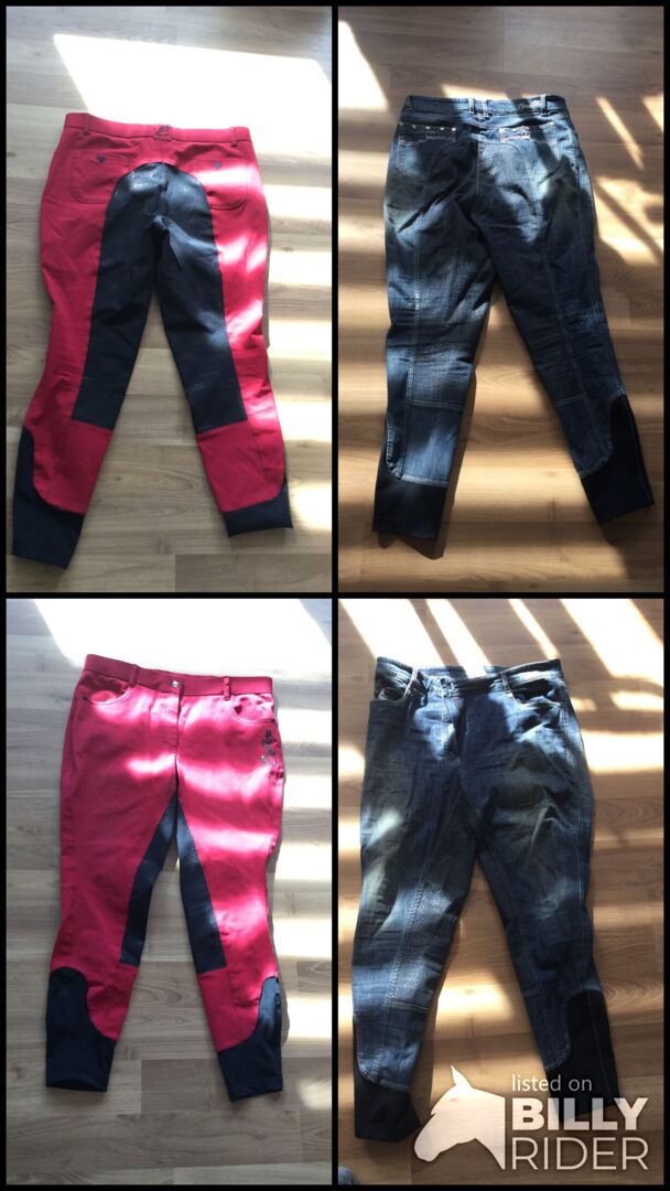 Reithosen-ekvivalent - Säljer 2 sällan använda byxor. Både Equilibre brand. Den ena är i denimlook med helgrepp, den andra är röd med svart helgrepp.