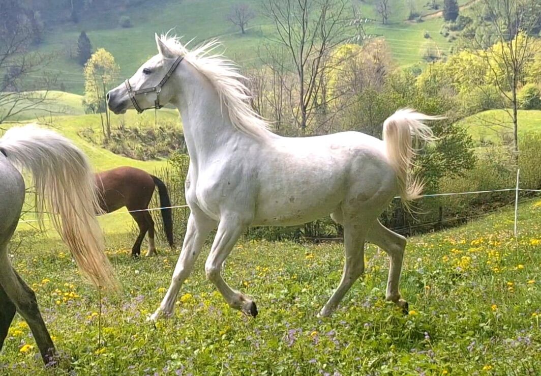 Soulhäst i vitt till salu på ett bra läge. Hon är mycket snäll mot människor, inklusive barn. Hayat genomgår för närvarande känslig träning med Karin Battaglia enligt Pat Parelli. Det skulle vara möjligt att delta i hennes träning och göra förfrågningar. Hon är uppfödd på stoet Nadjas linje från Marbach State Stud, hennes mor är ett elitsto och på sin fars sida var hon förfinad med Nagel-Ansatapferden. Hon har en höjd av 147cm. Om du är intresserad: 079 812 79 20