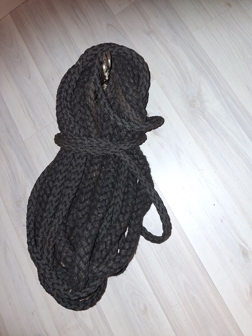 Rep med karbinhake - Jag erbjuder ett 15 meter långt rep med en karbinhake i änden. Repet blir tjockare in mot mitten.