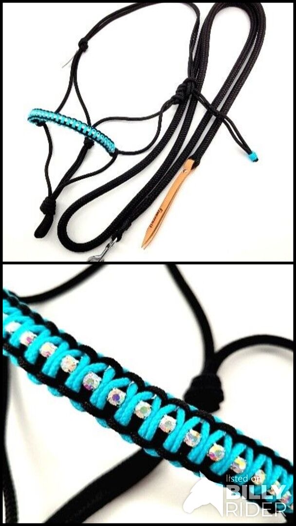 Rhinestone knut halter COB med rep BLACK - Rhinestone knut halter med rep svart I storlek Cob I färgen svart med turkos Med strassstenar Med matchande rep (2,5 m) Rep med läderflik Det låter som ett underbart set för din cob! Med rhinestone knot grimma med rep svart, som är dekorerad med gnistrande strassstenar, blir din häst inte bara ett blickfång under fotograferingen, utan den erbjuder också praktiska fördelar under markarbetet.